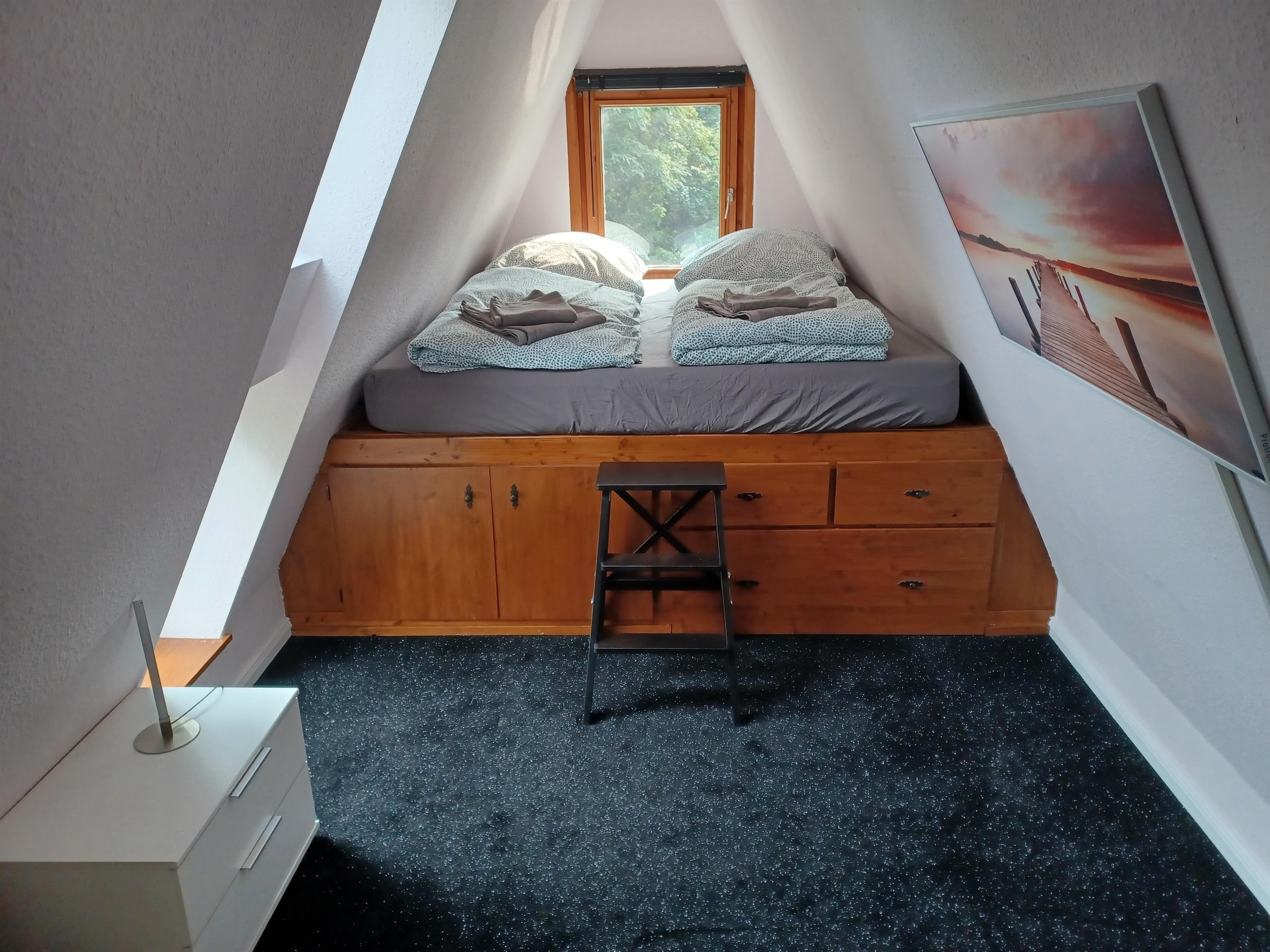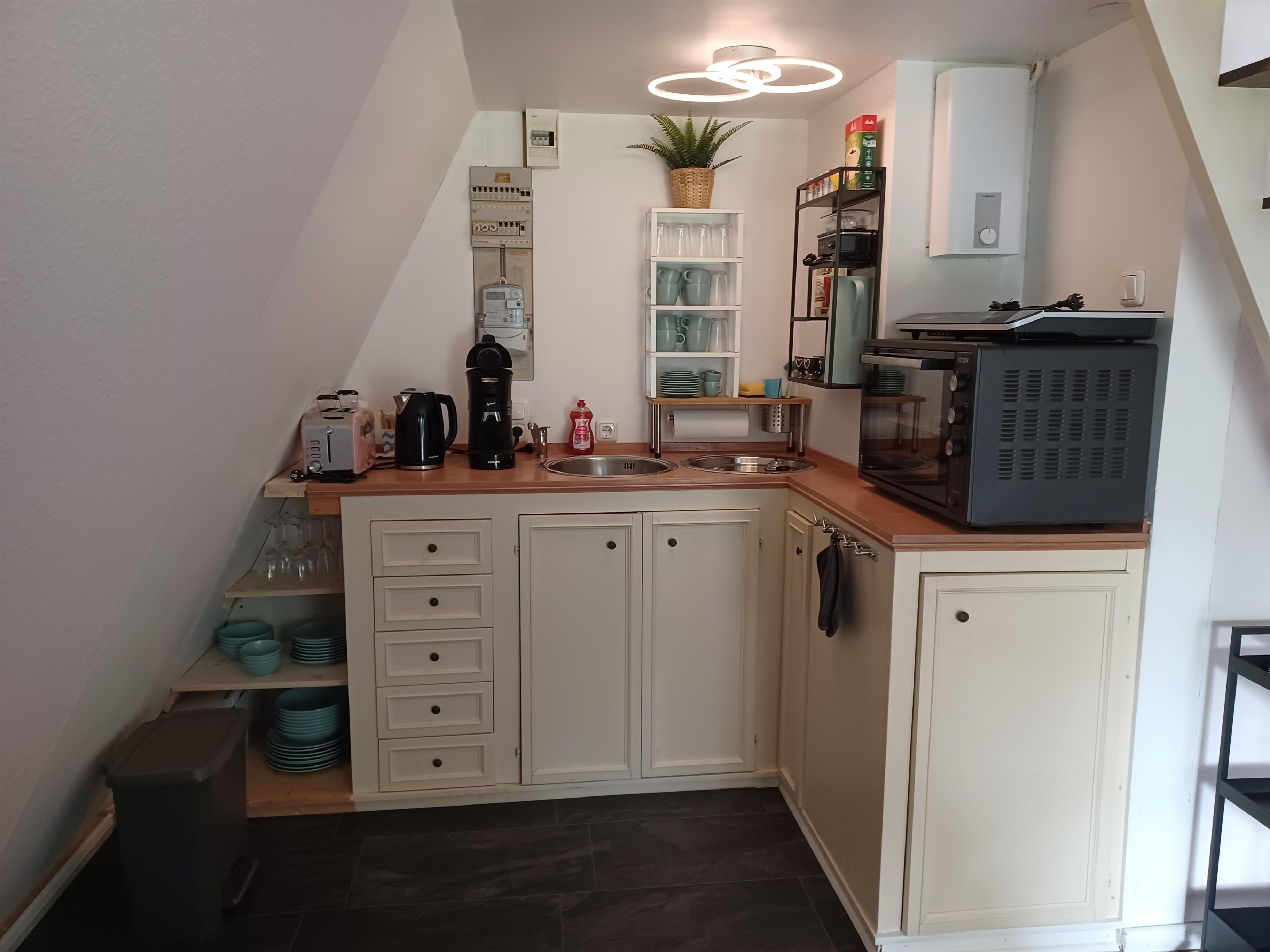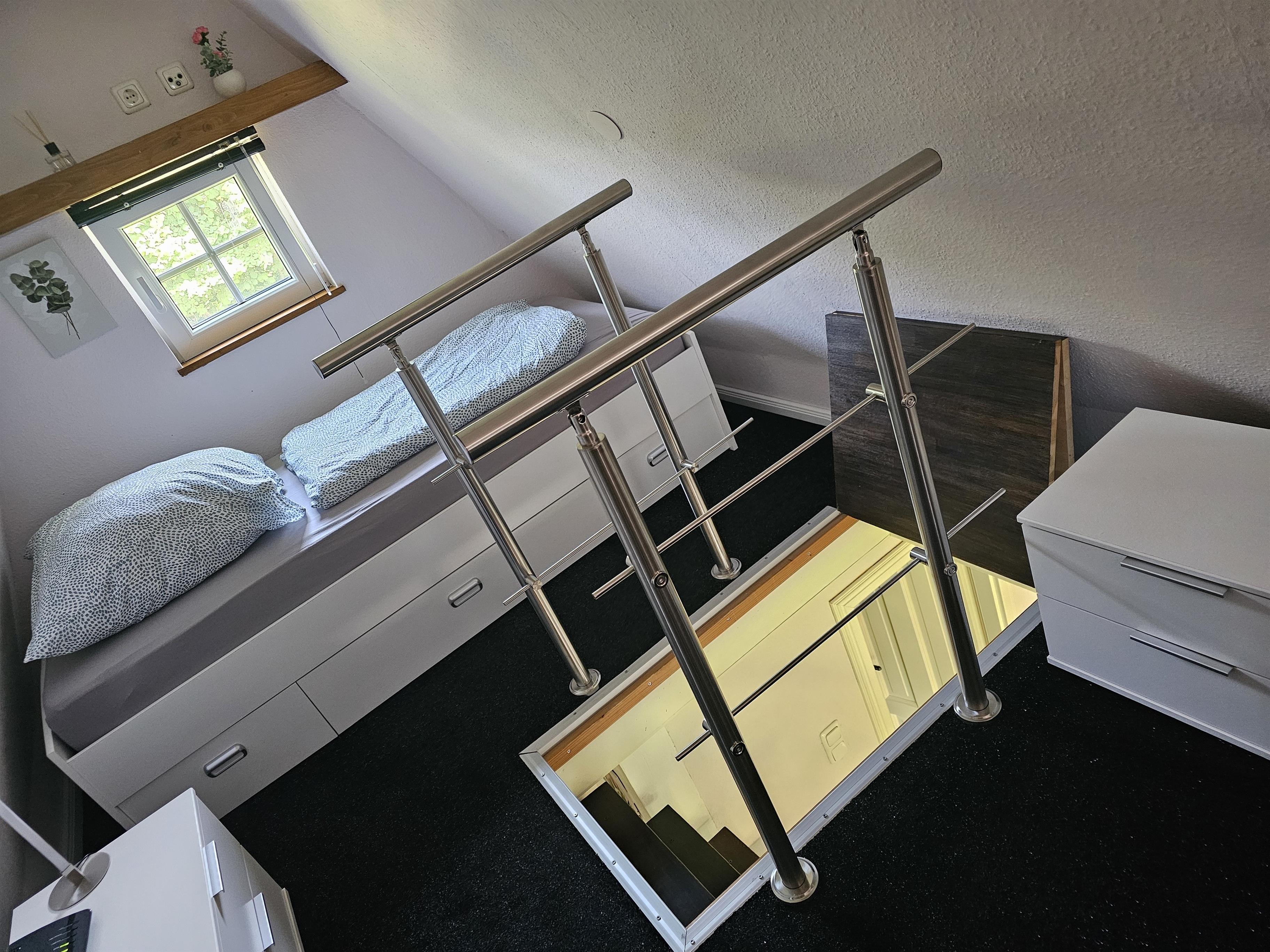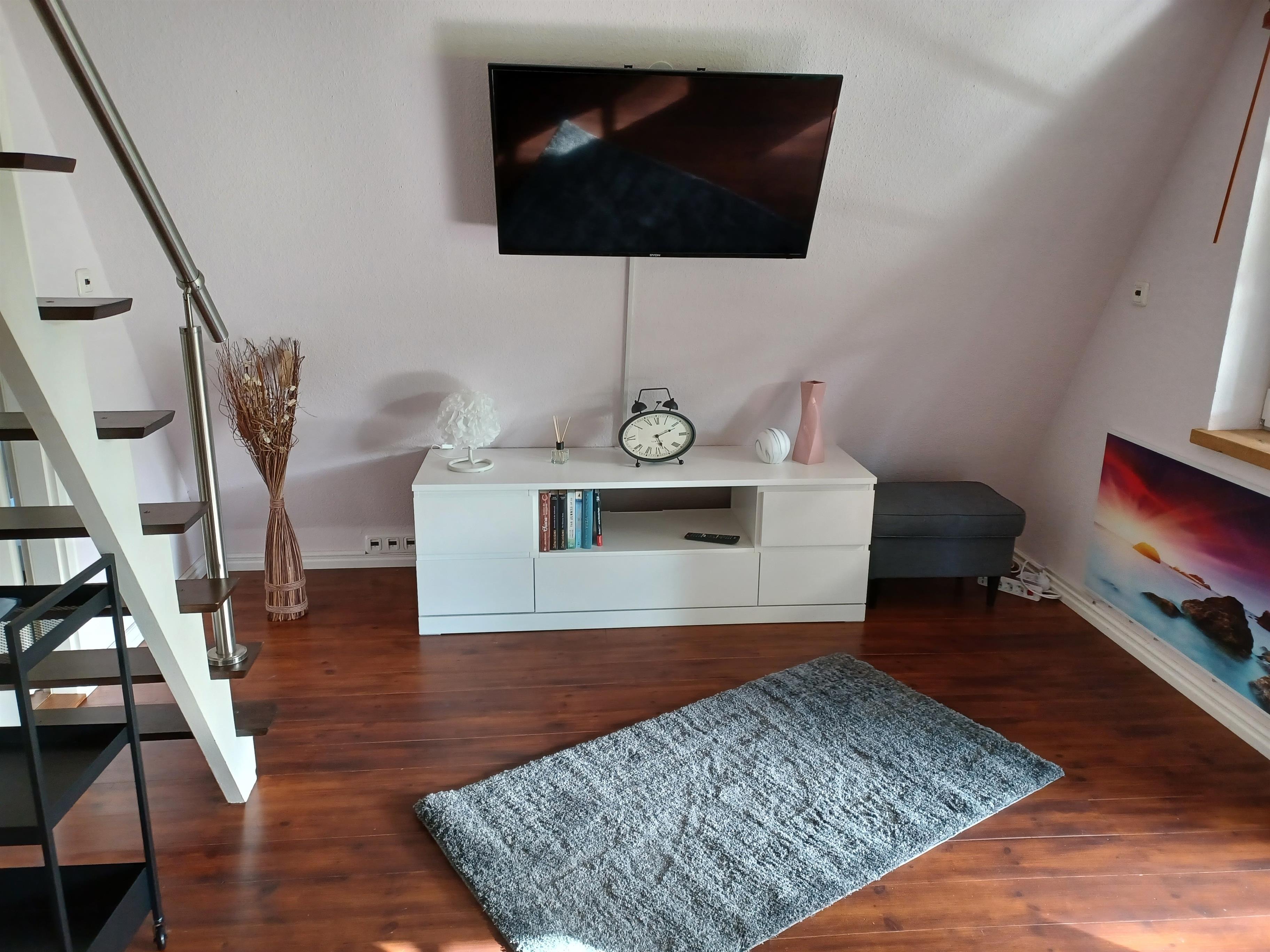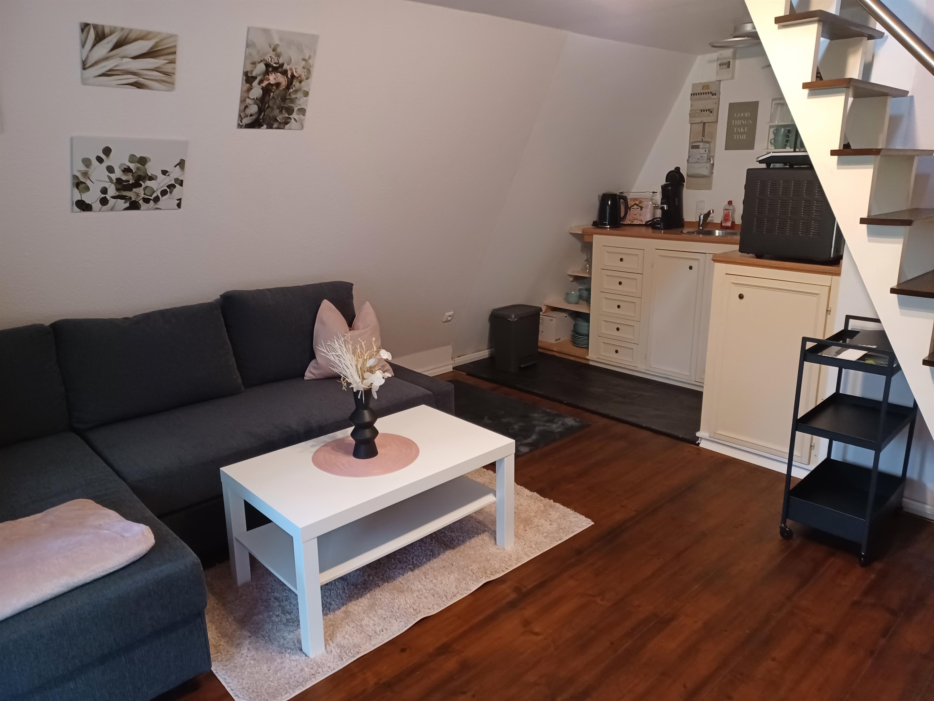 2 Etagen mit Treppe, 1 Schlafzimmer, 1 Wohnzimmer mit offener Küche, 1 Bad