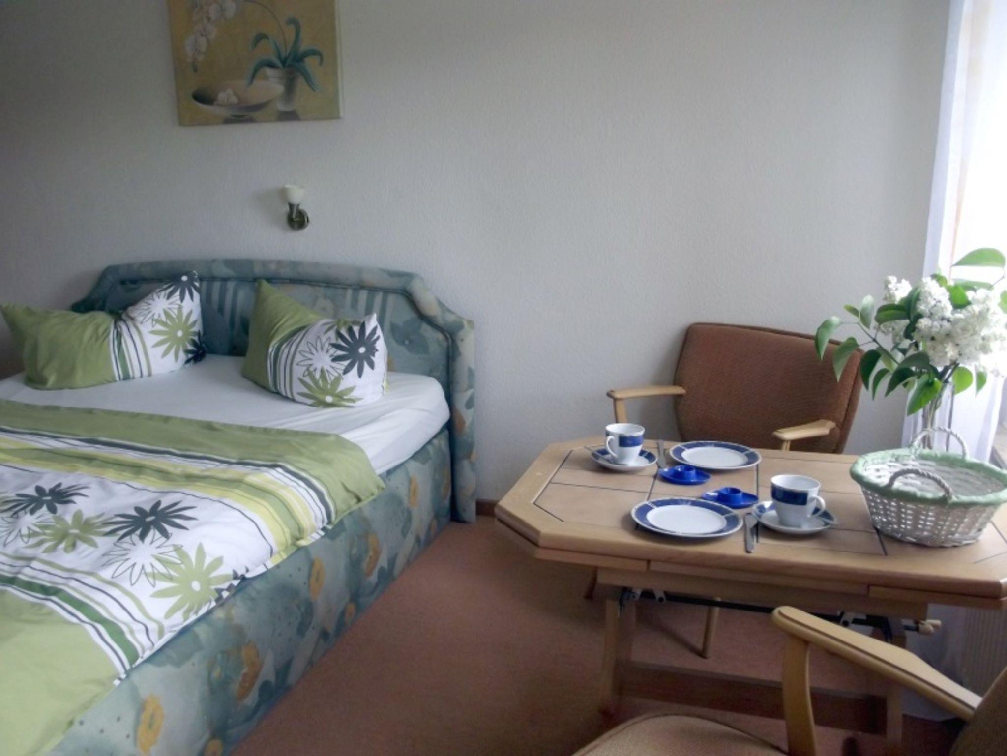 2005 neu eingerichtet, Erdgeschoss, 30 m², ruhige Lage, für 2 Erwachsene, kombiniertes Wohn-Schlafzimmer mit 2 Sesseln, Couchtisch, kleine Schrankwand mit Sat-TV und Doppelbett. Komplette Küchenzeile mit Wasserkocher, Toaster, Kaffeemaschine, Microwelle. Badezimmer mit Dusche und WC. Die Wohnung verfügt über eine Terrasse mit Sitzmöbeln sowie über eine Sitzgelegenheit mit Gartenmöbeln auf dem Grundstück.