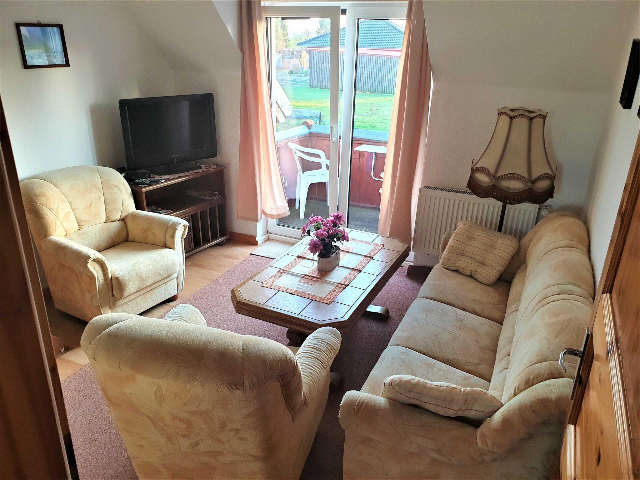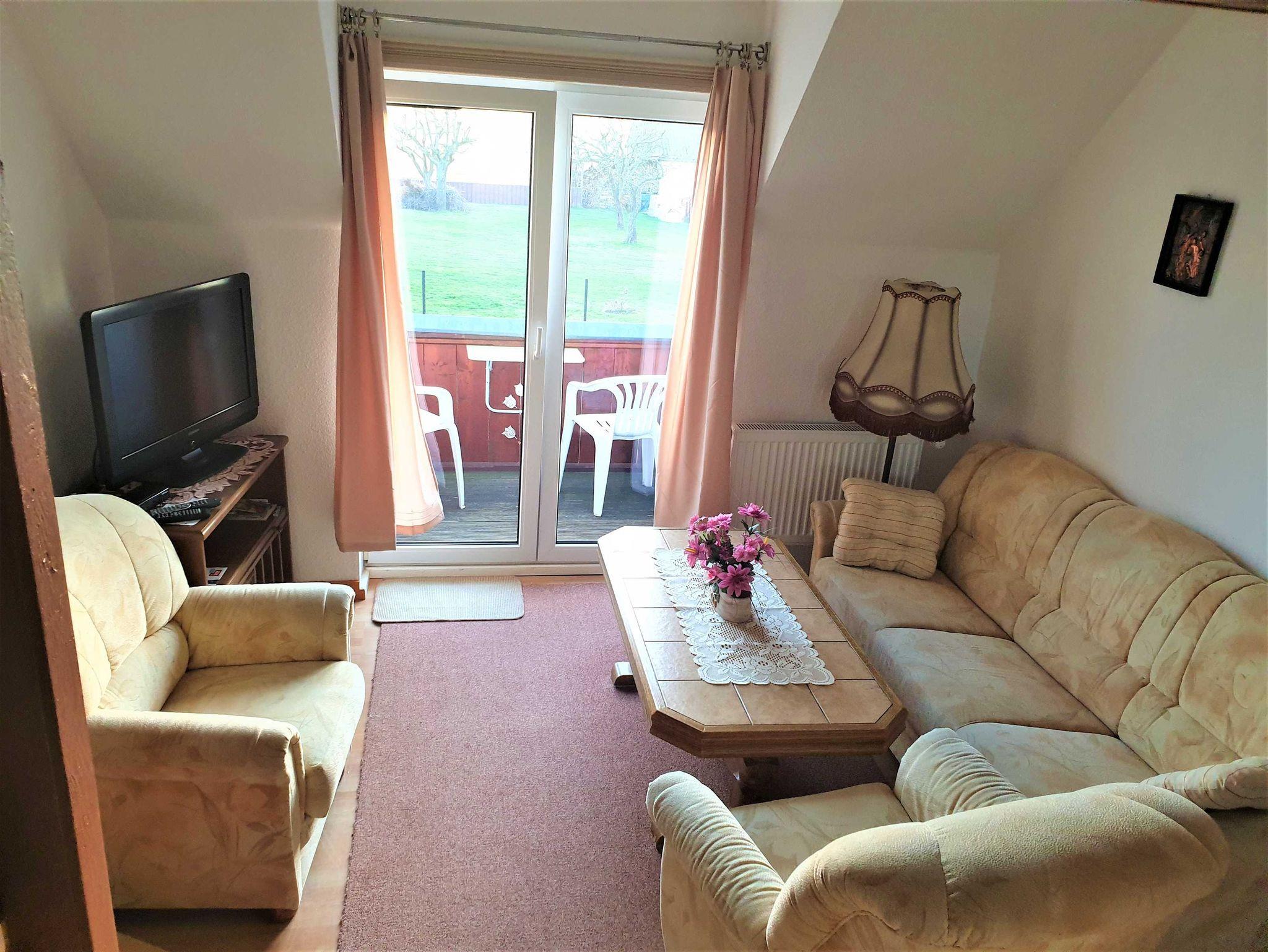 Die Ferienwohnung befindet sich in der 1. Etage mit Balkon und hat einen kleinen Flur. Das Wohnzimmer hat eine