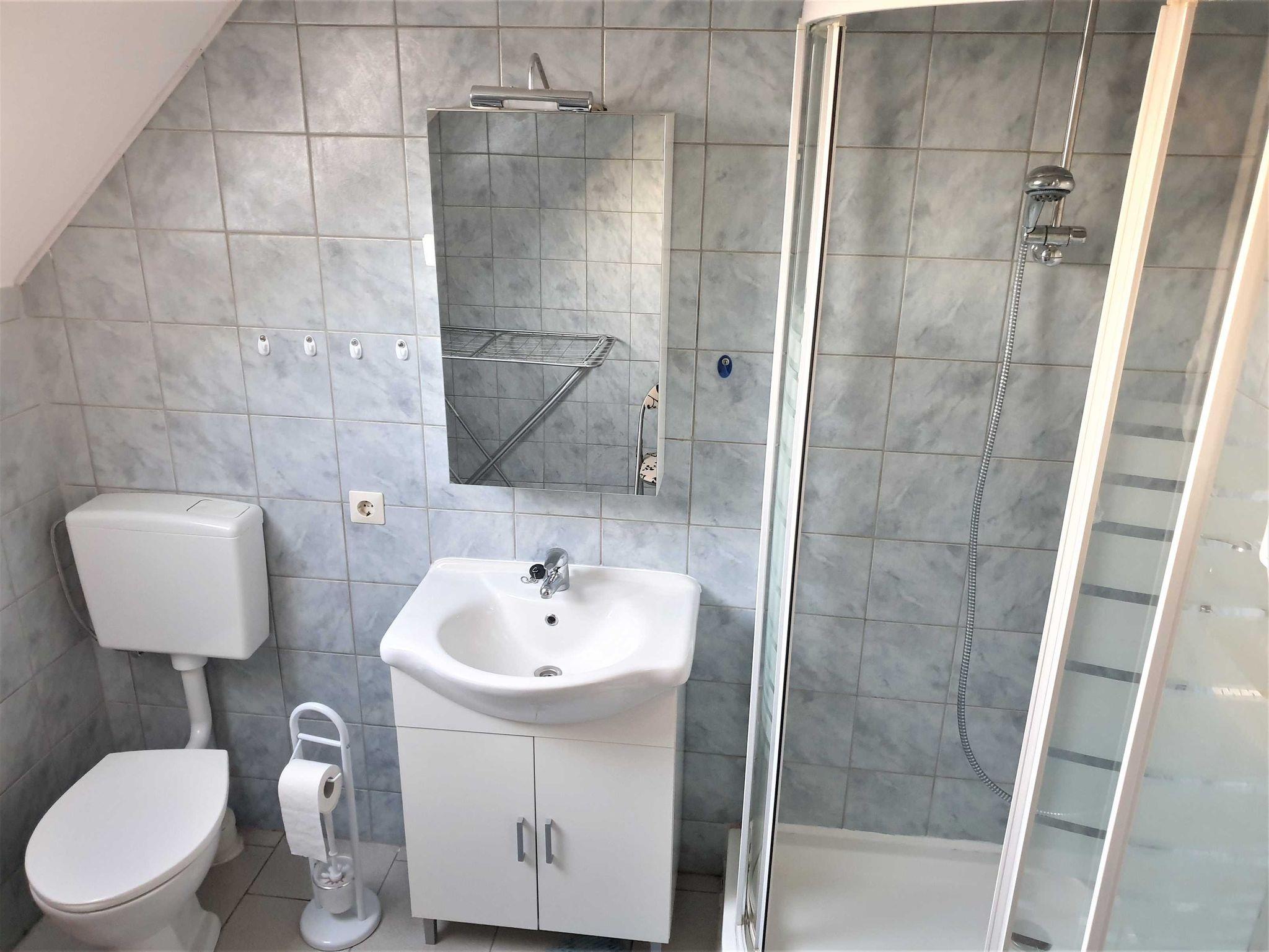 DU/WC. Das Schlafzimmer befindet sich zur Hofseite mit Blick ins Storchennest auf dem Scheunendach. Es verfügt über ein Doppelbett.