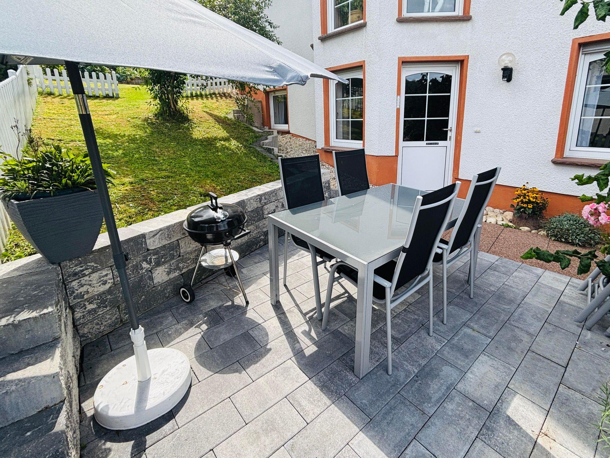 Auf der großzügigen Terrasse können alle Personen am Tisch platz nehmen und entspannt die gute reine Eifel Luft genießen. Auf der Terrasse befindet sich ein Grill, der zu einem gemütlichen Grillabend einlädt.