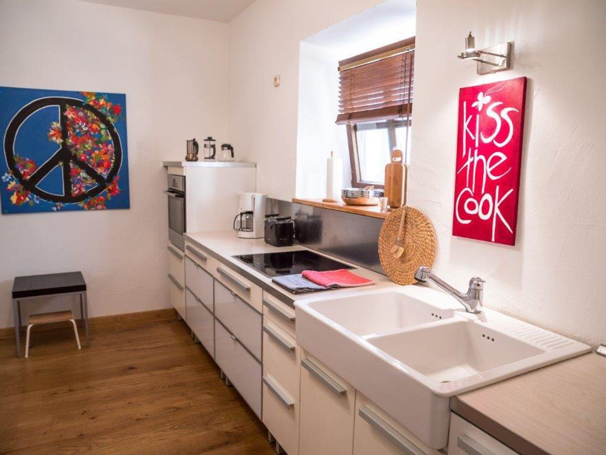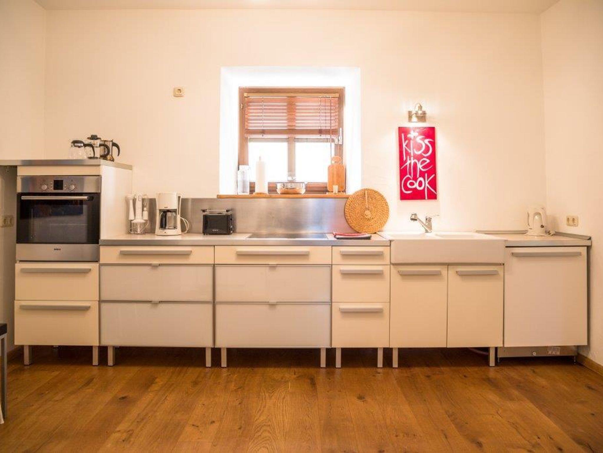 eine moderne, voll ausgestattete Einbauküche (Wohnküche, ausgestattet für 6 Personen, Toaster, Kaffeemaschine, Backofen, Ceranfeld, Geschirrspüler, Kühlschrank mit Gefrierfach, Wasserkocher, Mixer),