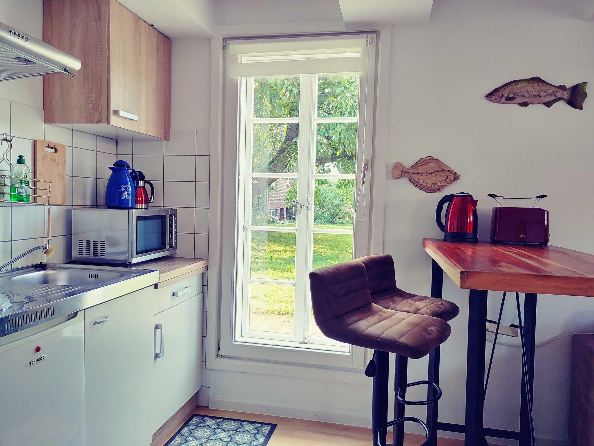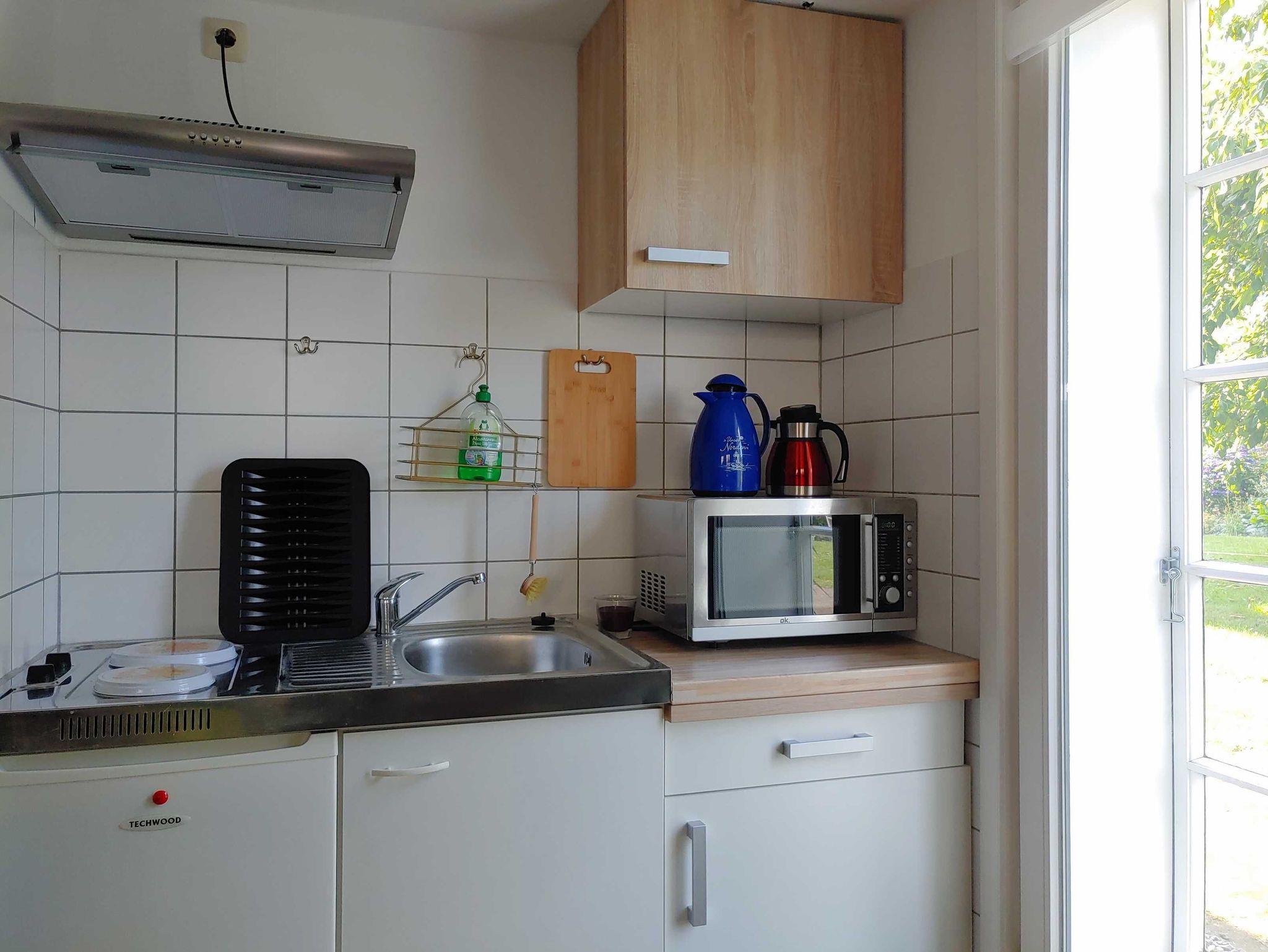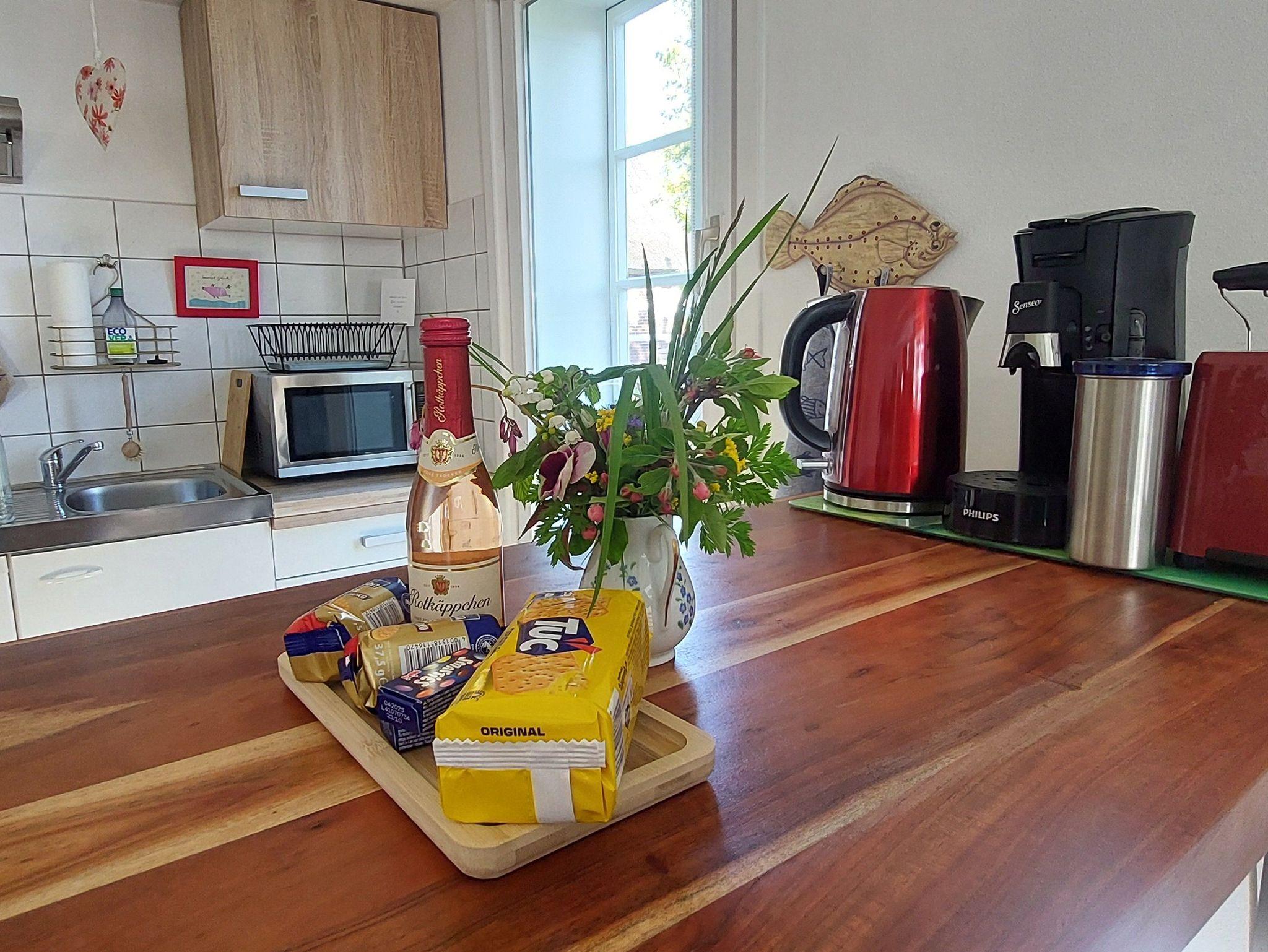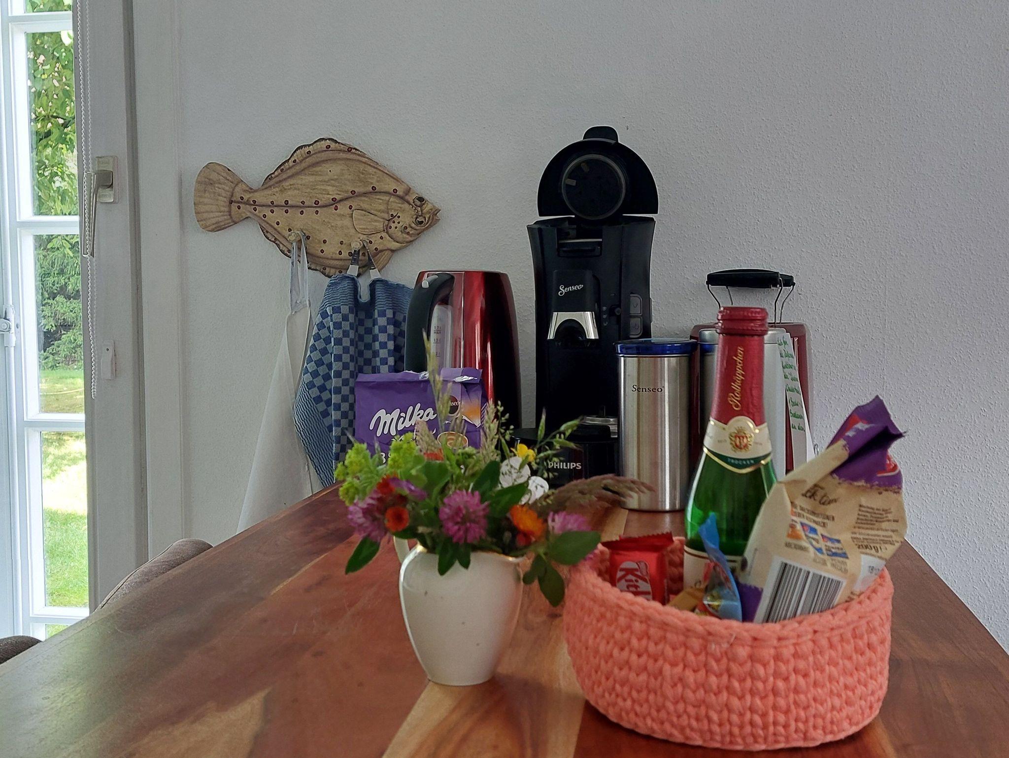 Eine kleine Grundausstattung an Zucker + Salz, Kaffee +Tee, Reinigungsmitteln + gute Laune erwartet Sie. Frische Brötchen gibt es wochentags in 200m Entfernung, sonntags in 800m, der Weg führt durch den Buchenwald an unseren Buschteichen vorbei, natürlich gibt es auch eine Straßenvariante. Ihren Sitzplatz im Garten suchen Sie sich selber aus, je nach Sonnenschein.