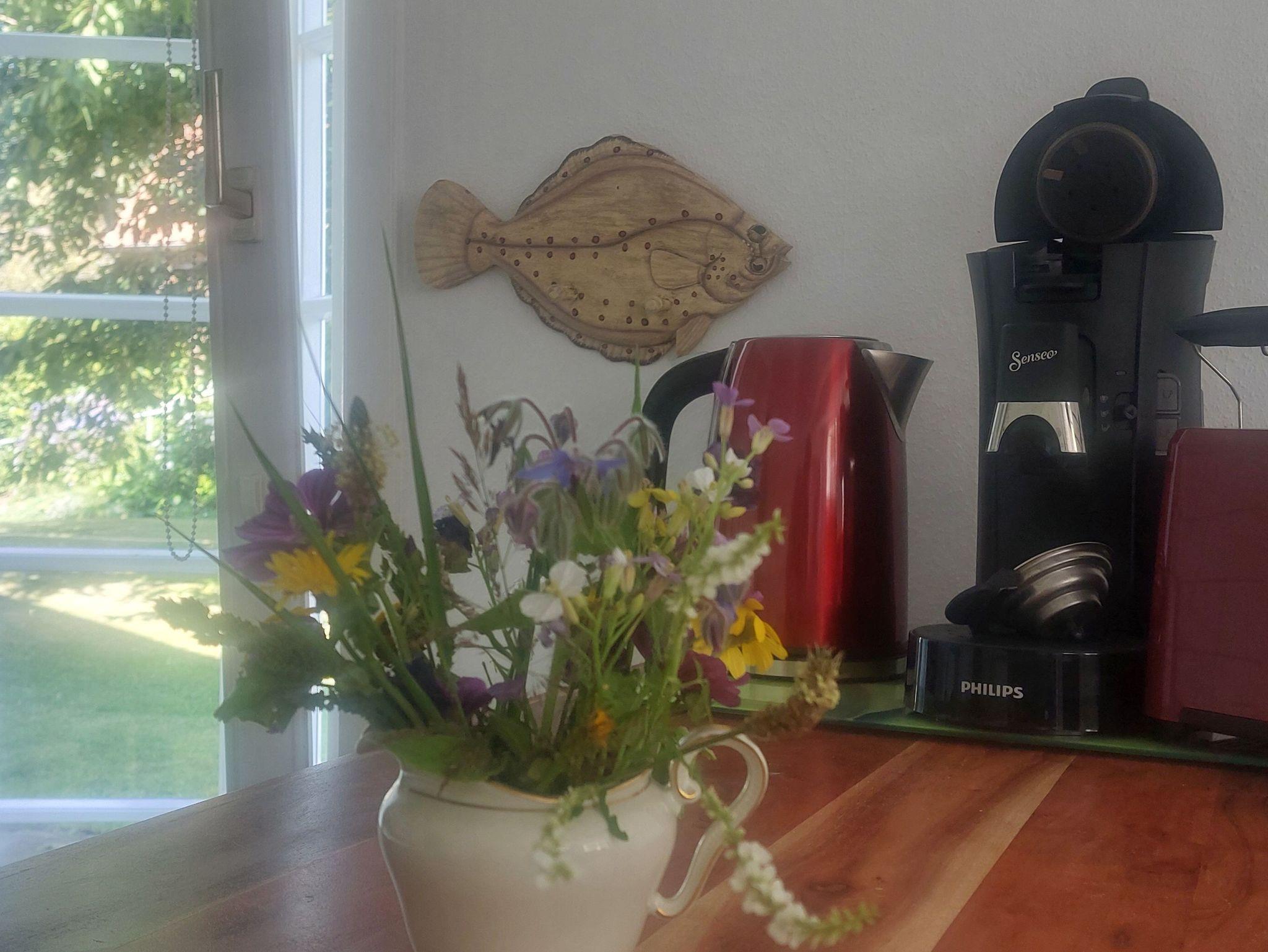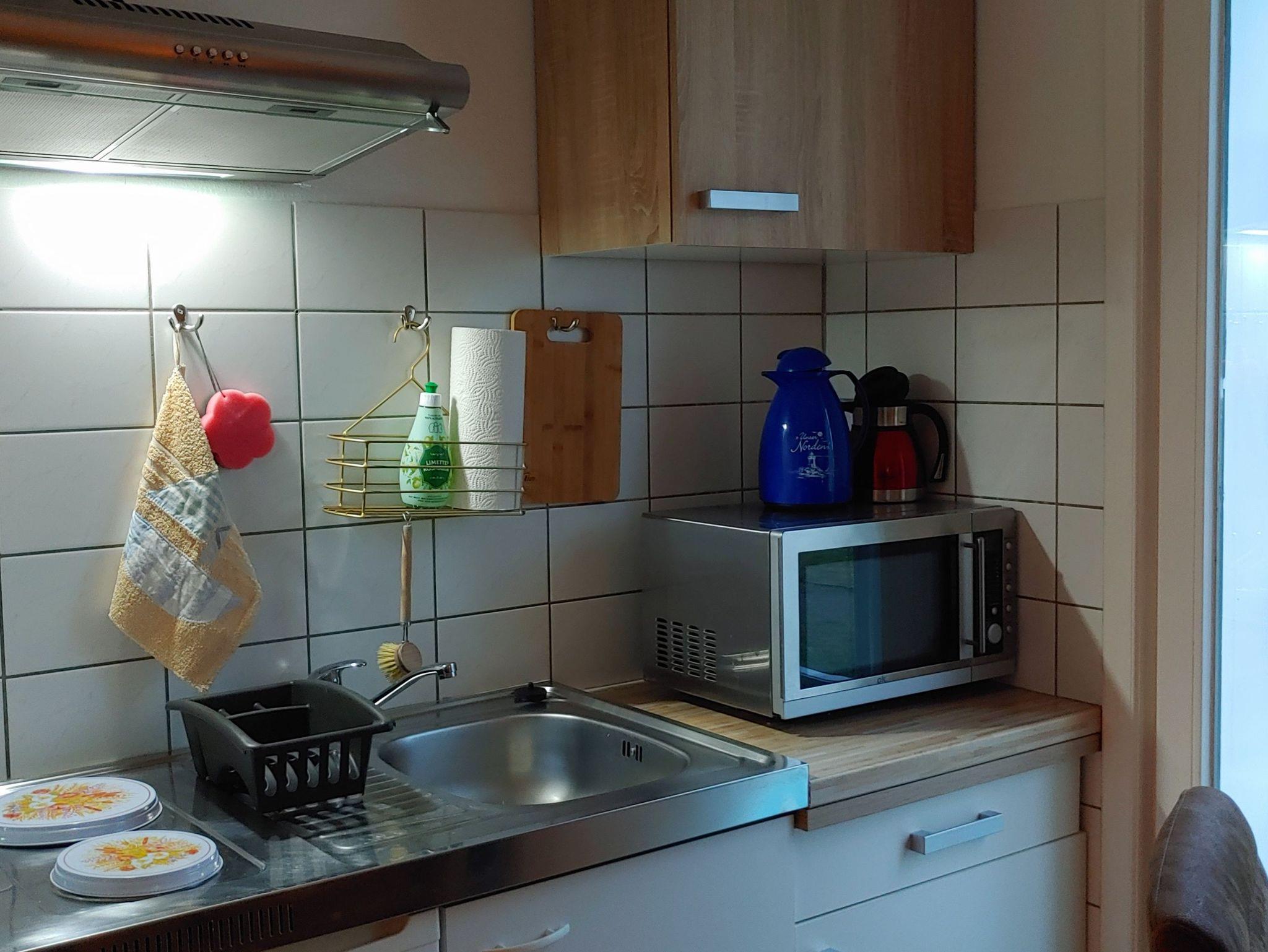 Küche voll eingerichtet. Kleiner Vorrat an Kaffee, Selter, Essen, Gewürzen, gute Laune, Klopapier :)