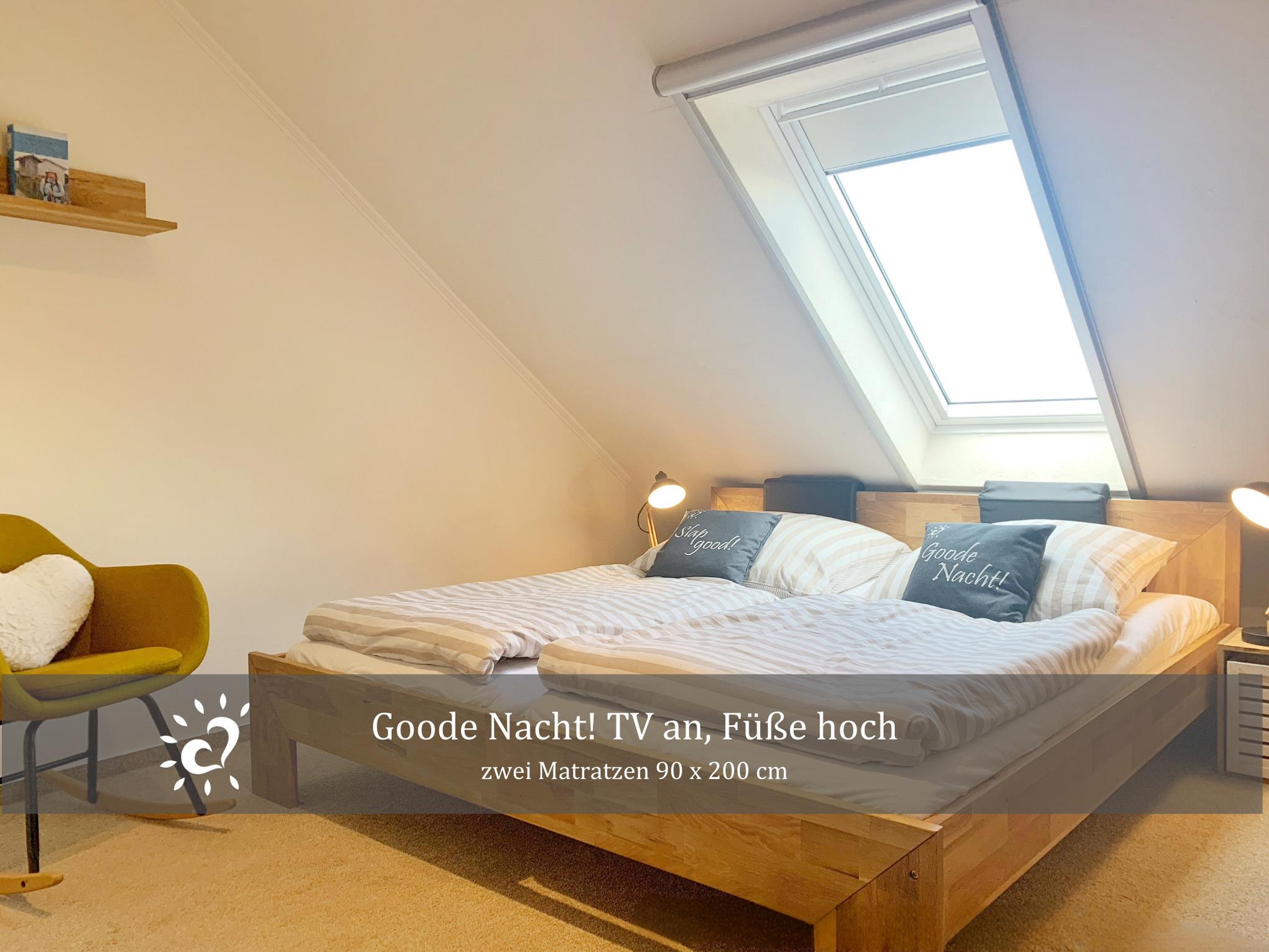 Über die Treppe gelangst du in das großzügige Hauptschlafzimmer mit einem komfortablen Doppelbett und einem zusätzlichen Fernseher. Ein Rückzugsort, der ideal ist, um den Tag entspannt ausklingen zu lassen.