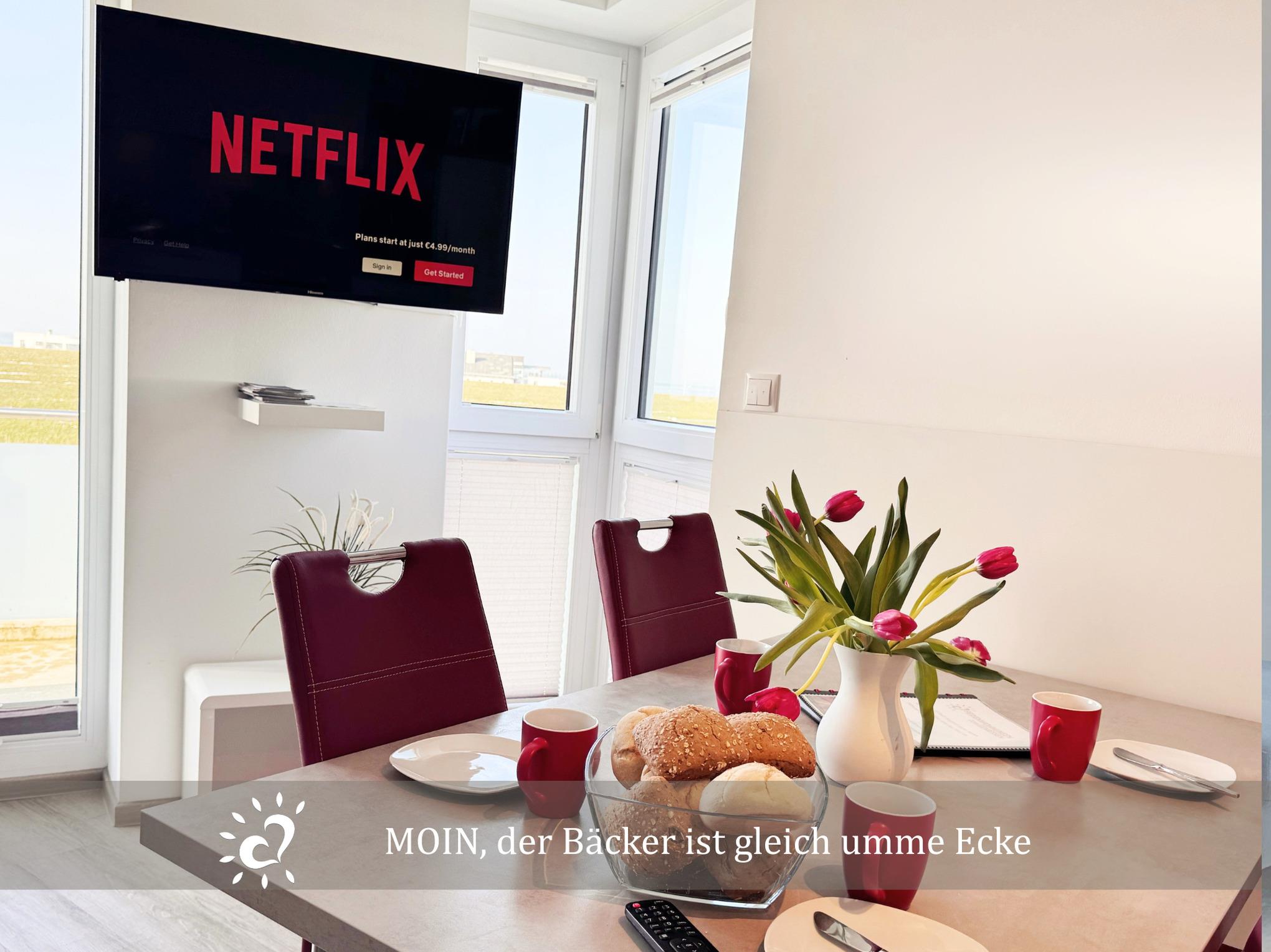 Genieße deinen Urlaub in einem Penthouse in erster Reihe mit direktem Meerblick auf das Nordsee-Wattenmeer. Von der großen Dachterrasse aus kannst du die frische Meeresluft einatmen, den weiten Blick auf Ebbe und Flut genießen und jeden Abend spektakuläre Sonnenuntergänge erleben – ein Erlebnis, das direkt vor deiner Tür beginnt.