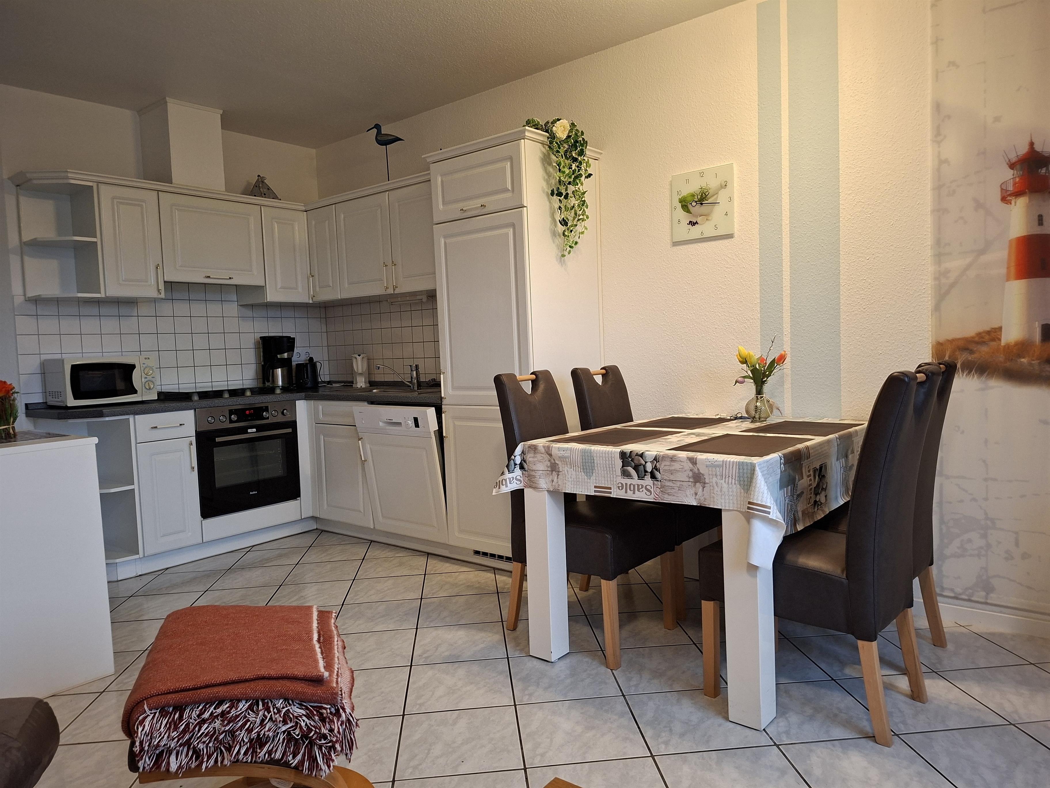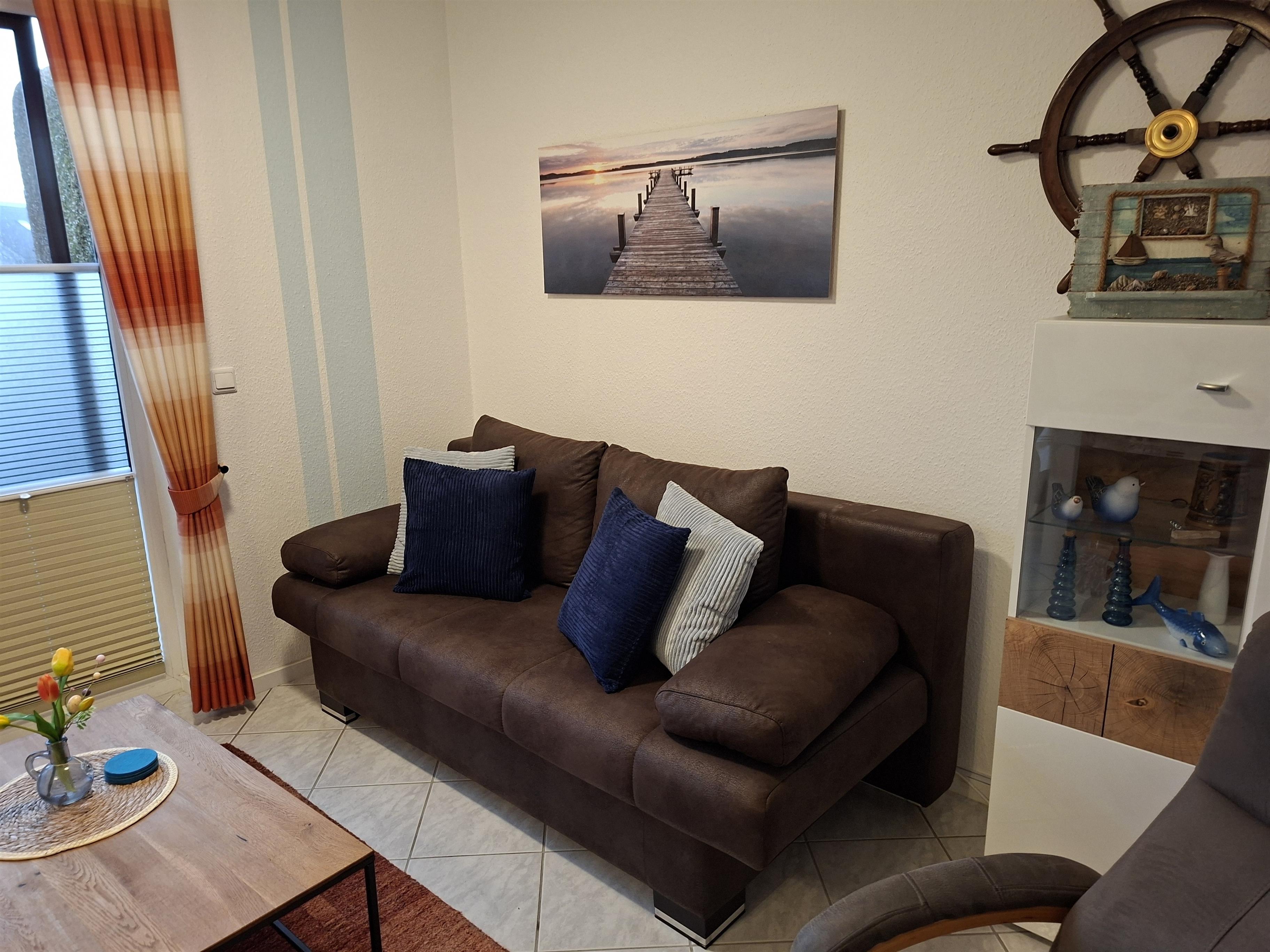 Geräumiges Wohnzimmer mit Essplatz, Schlafsofa. Komplett eingerichtete Küche mit Kühlschrank incl. Gefrierfach,
