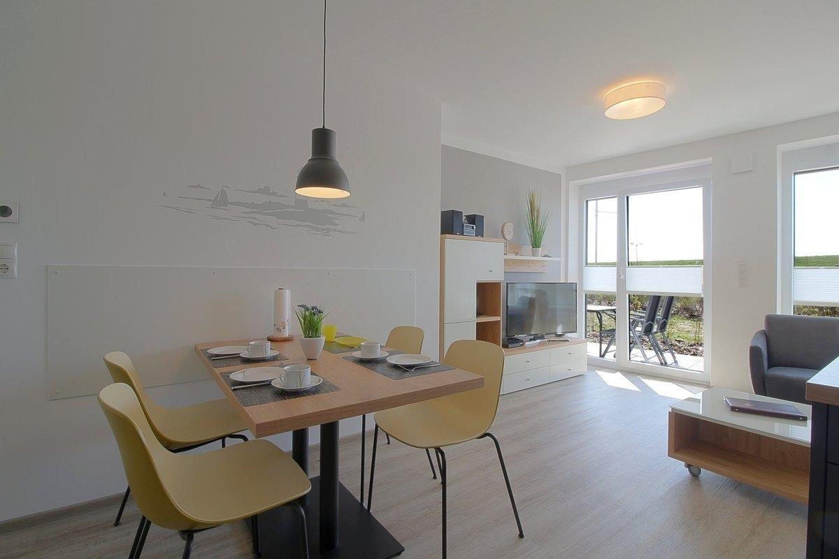 Die sonnige Wohnung liegt im Hochparterre mit einer Terrasse mit Deichblick und bietet Platz für 3 Personen + Kleinkind.