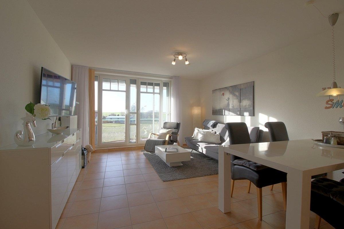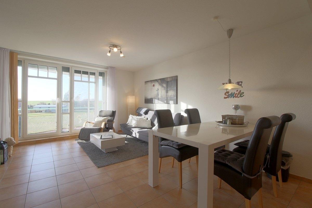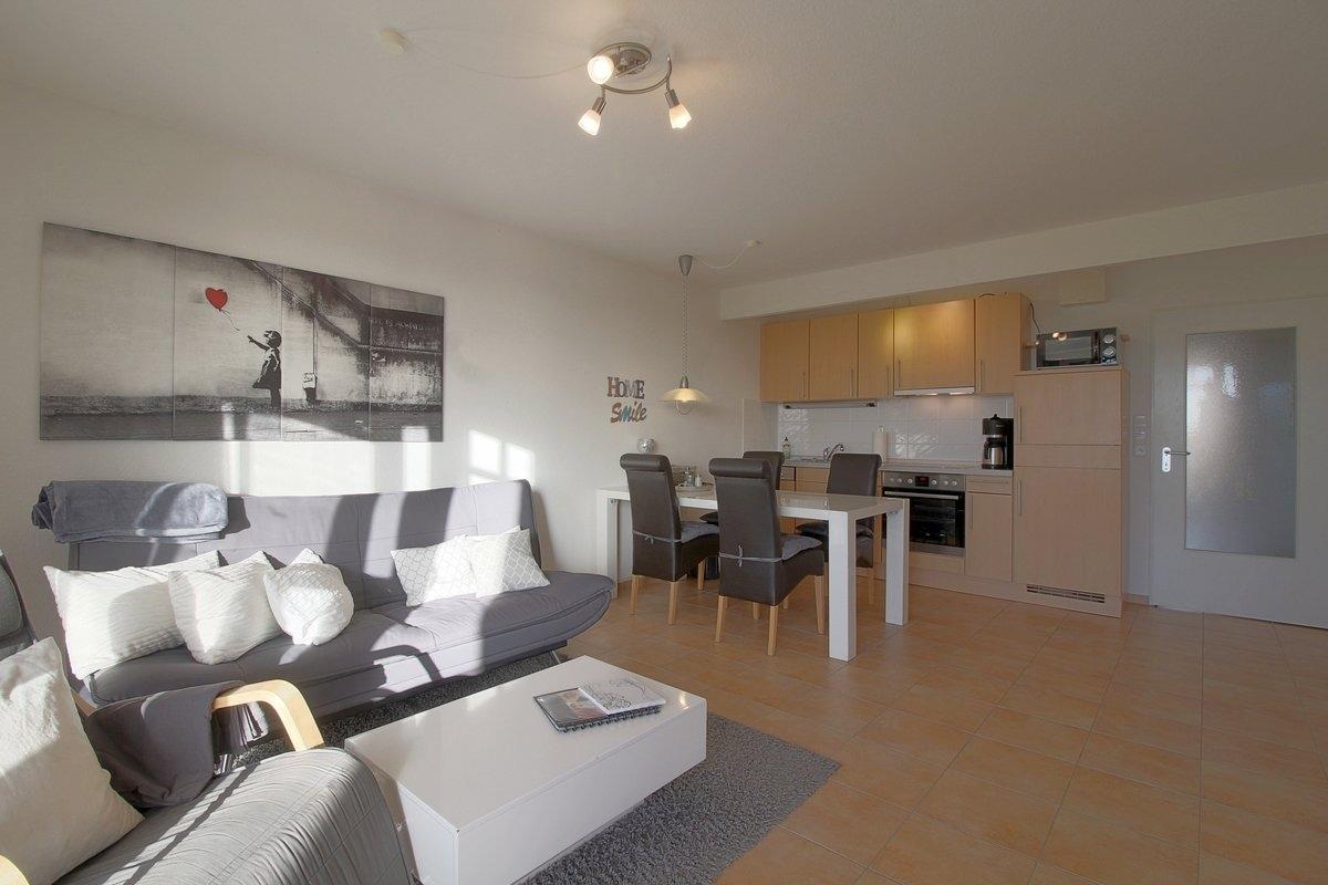 Geschmackvoll eingerichtet ist der Wohn-Essbereich mit einer komplett ausgestatteten Einbauküche, Spülmaschine, Mikrowelle, Kaffeemaschine und Senseo. Im Wohnbereich befindet sich ein auf zirka 1,50m x 2.0m ausklappbares Sofa, auf welchem zusätzlicher Schlafraum für 1 bis 2 Kinder gegeben ist. Ein großer 50 Zoll-Flachbildschirm inklusiver kostenfreier Sky-TV und DAZN Q-App verschönern Ihren Aufenthalt bei uns.