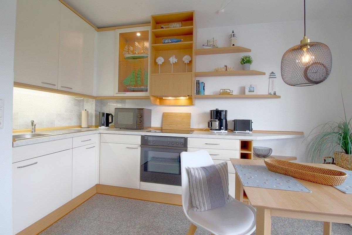 Die Küchenzeile ist mit allem eingerichtet, was der Hobbykoch braucht. Von der Kaffeemaschine bis zum Toaster ist alles vorhanden. Das Wohnzimmer ist modern und bequem eingerichtet.