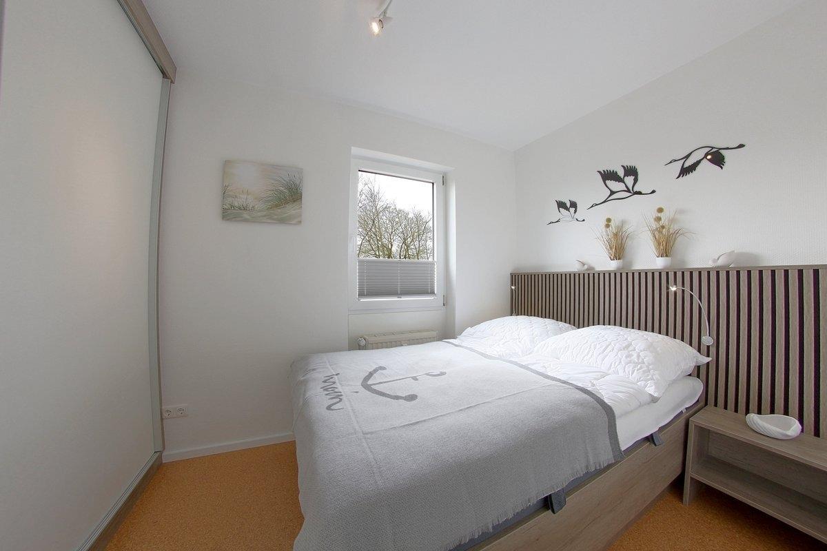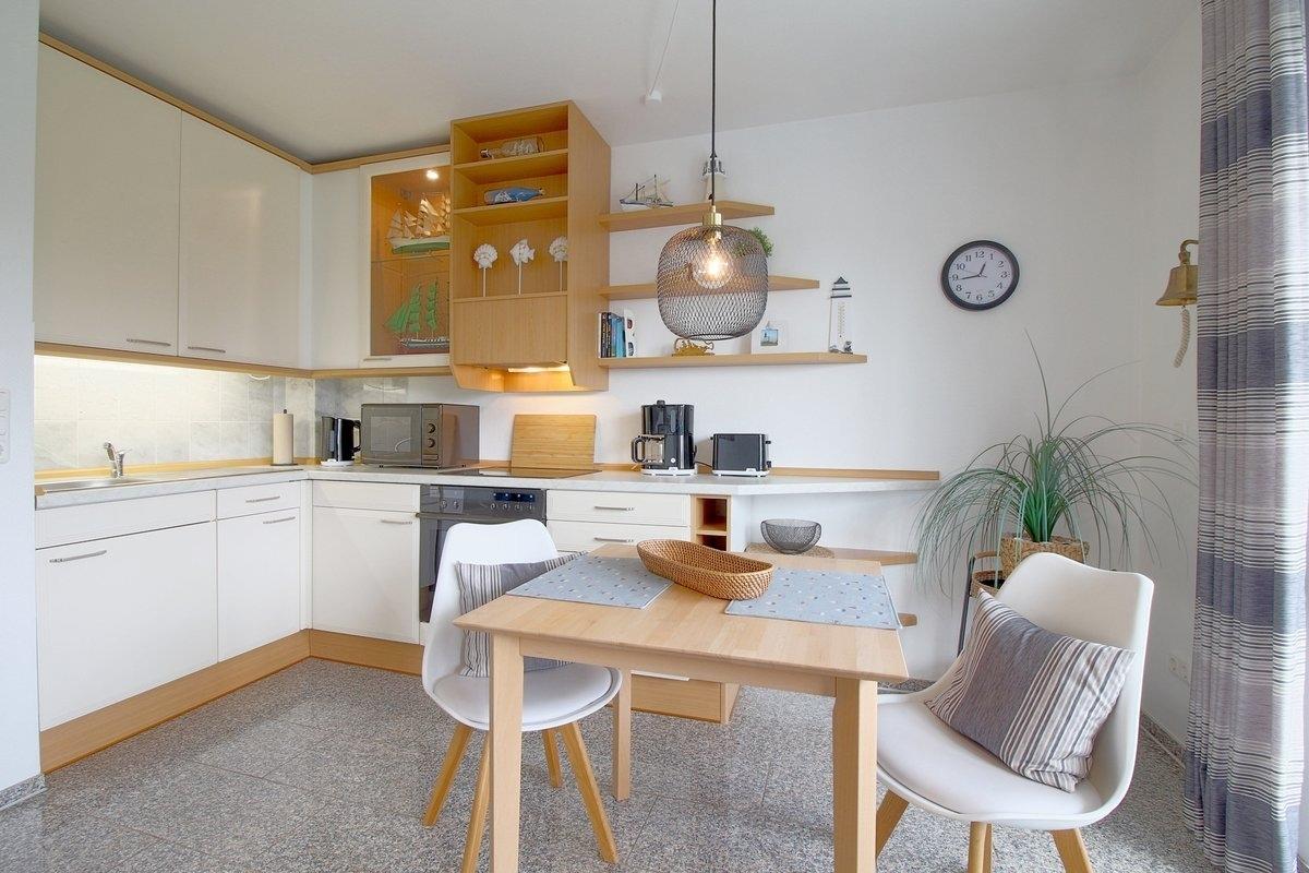 Im maritimen Look präsentiert sich diese Nichtraucher- Ferienwohnung mit einem Schlafraum mit Doppelbett (1,40 x 2,00 m), großer Küchenzeile und Wohnraum mit Sitzecke und TV. Hochwertige Fußböden mit Granit und Korkparkett.