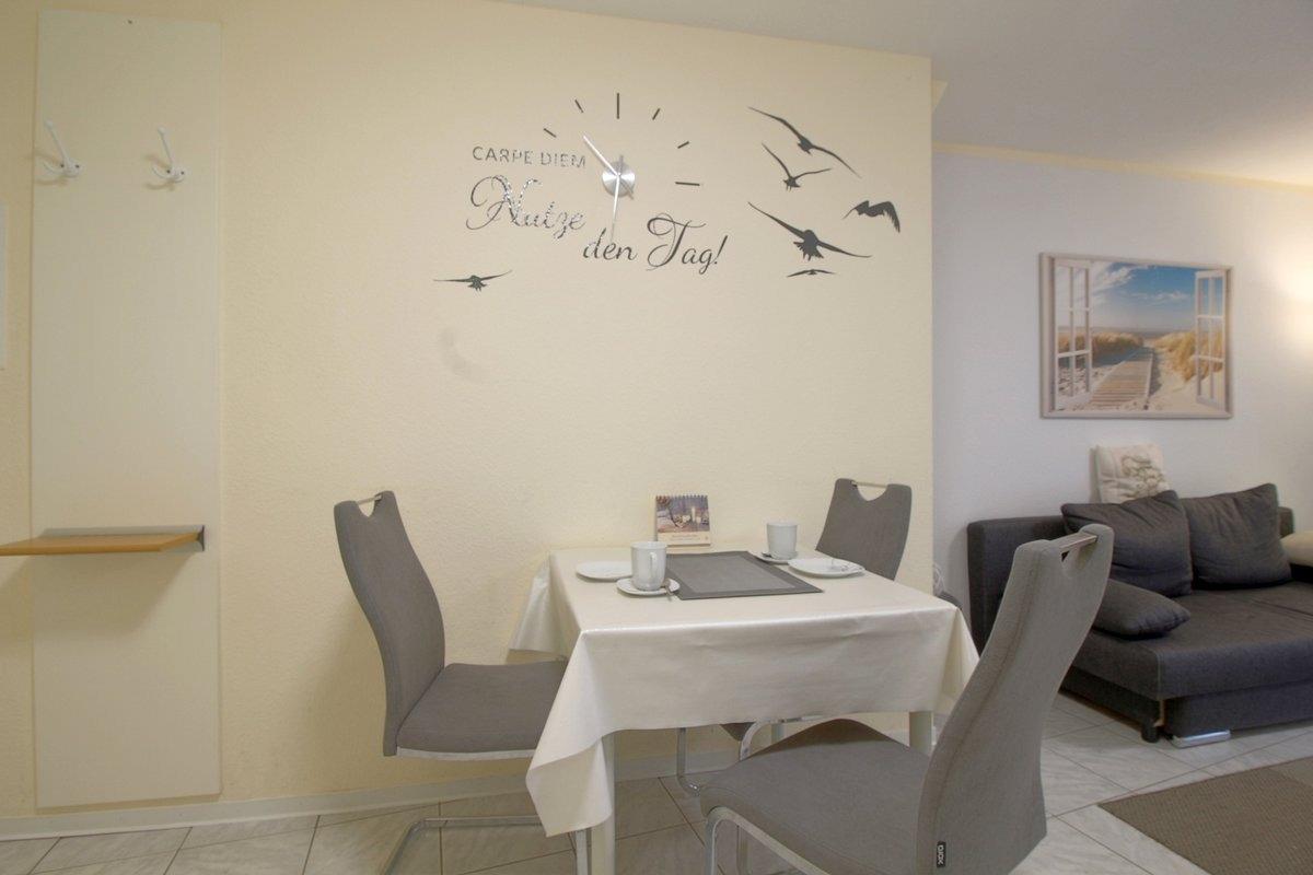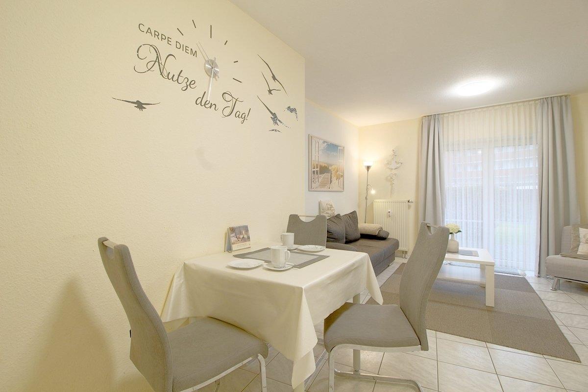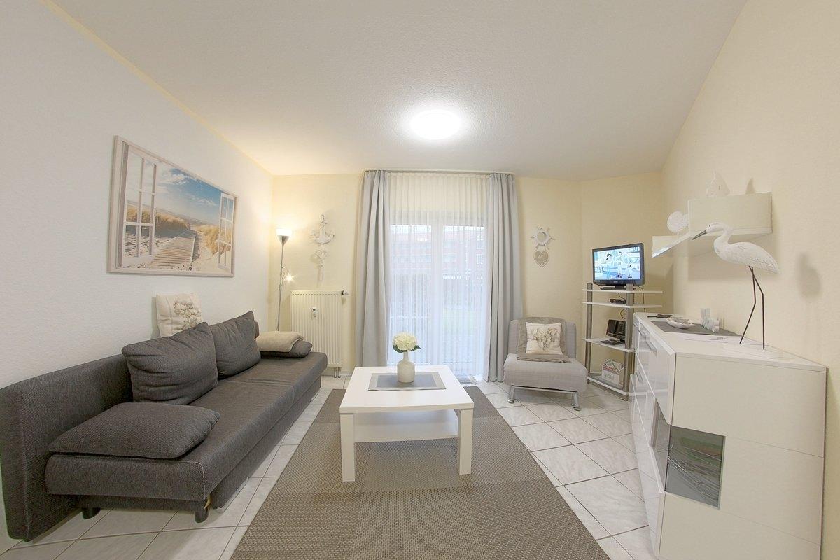 Helle Terrasssenwohnung für 2 Erwachsene und 2 Kinder mit offenem Wohn-, Ess- und Küchenbereich komplett gefliest und Ausgang zur Terrasse mit Strandkorb und Gartenmöbeln. Im Wohnbereich gibt es eine Schlafcouch (1,60x2,00 m), TV und Internet