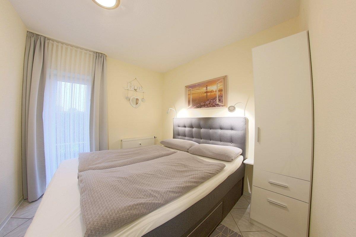 Im Schlafzimmer sorgt das Boxspringbett (1,60x2,00 m) für erholsame Nächte. Auch hier geht es direkt hinaus auf die Terrasse.