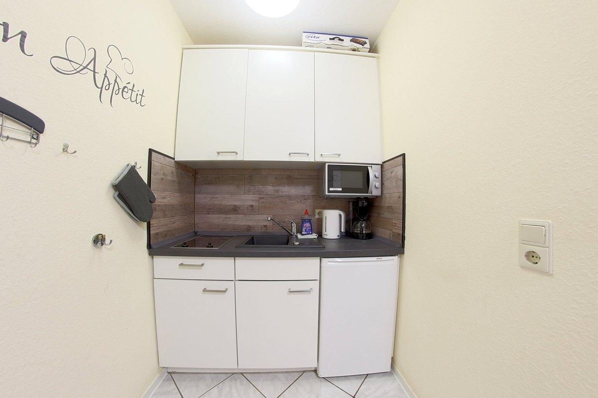 In der kleinen Pantryküche mit 2 Plattenherd, Mikrowelle und KÜhlschrank können Sie kleine Mahlzeiten herrichten.