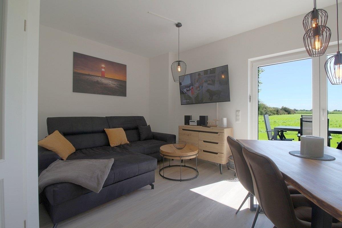 Der Mittelpunkt des im Juli 2023 fertiggestellten, modern gestalteten Hauses ist ein Wohn-Esszimmer mit integrierter moderner Einbauküche und Flat-TV.