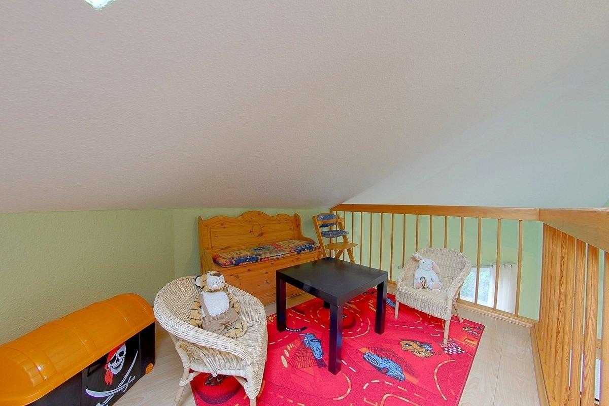 Des weiteren befindet sich ein Schlafzimmer mit Doppelbett und ein helles Duschbad mit WC im Untergeschoss. Im Obergeschoss ist ein Schlafraum für Kinder mit 2 Einzelbetten und TV vorhanden und eine Galerie als Spielbereich für die Kinder.