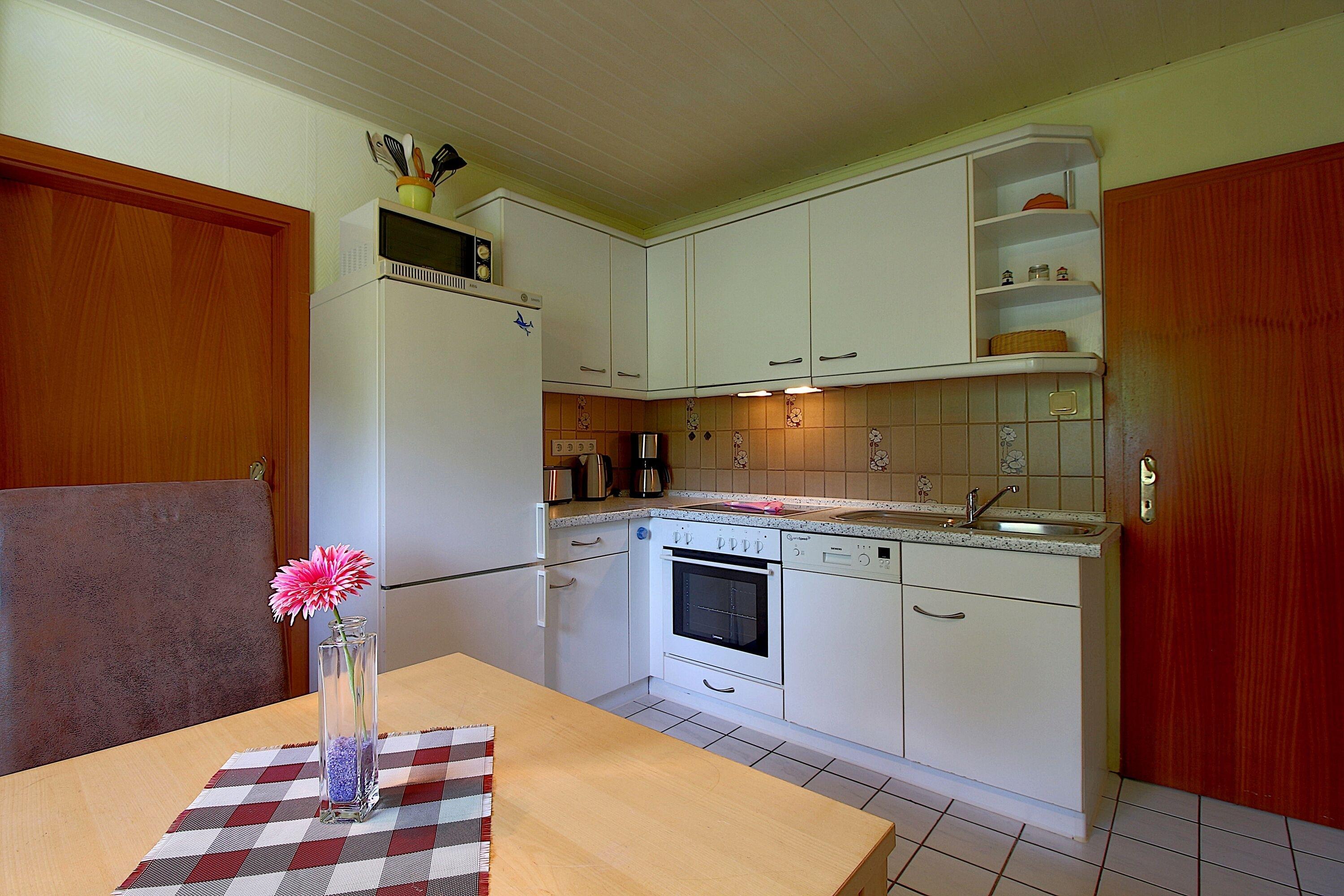 Zur Ausstattung gehören kostenloses WLAN, ein Bad mit Dusche, eine Waschmaschine, eine gut ausgestattete Küche, eine gepflasterte Terrasse mit Grillplatz sowie ein Stellplatz direkt am Haus und ein Fahrradschuppen. Die Lage ist ideal, nur etwa 800 Meter vom Strand, Hundestrand, Meer, Hafen, Schwimmbad und Deich entfernt. Besonders hundefreundlich sind die Bodenbeläge wie Fliesen, Laminat und Parkett, da keine Teppiche vorhanden sind.