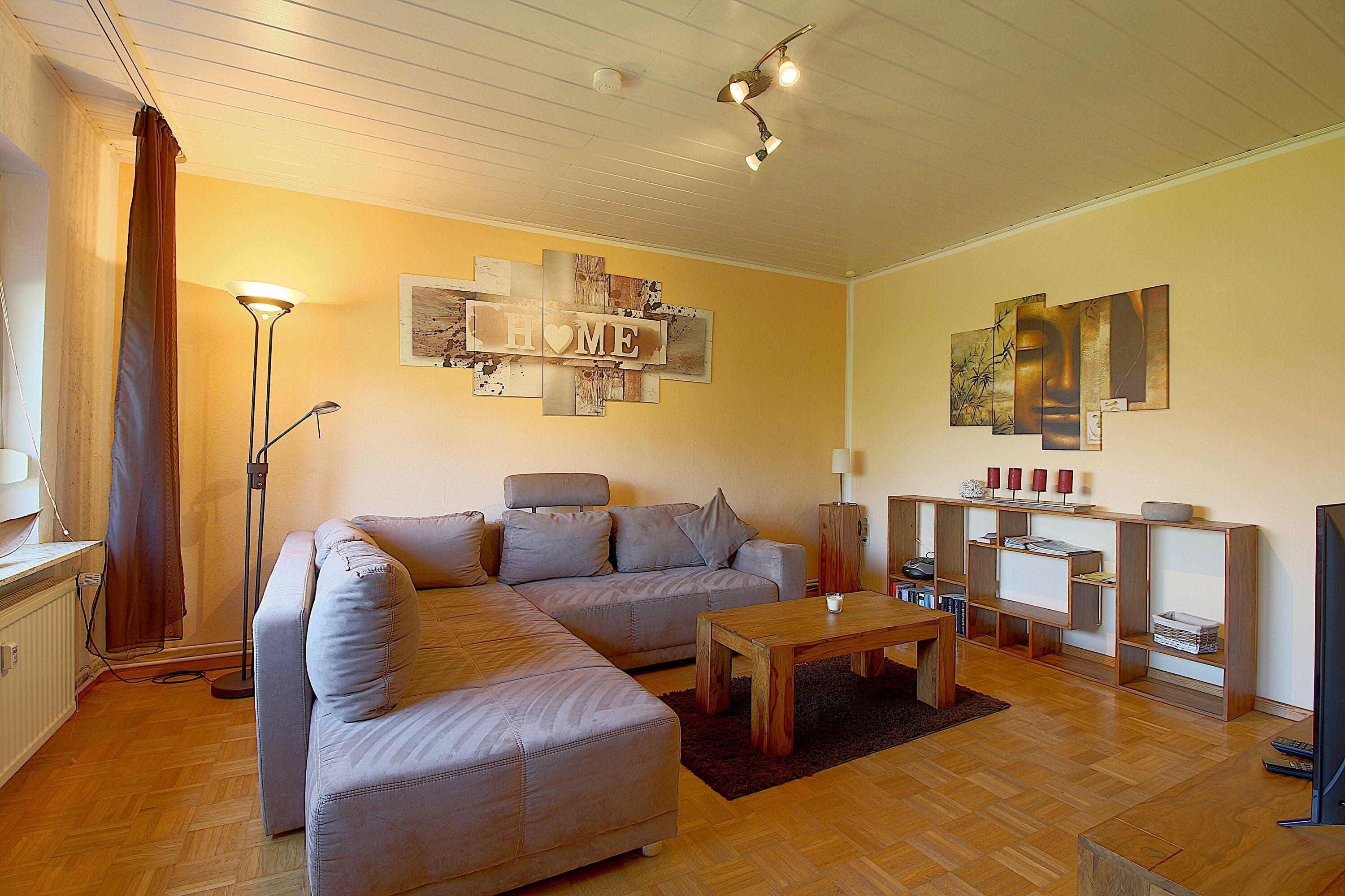 Mit einem großen, eingezäunten Garten zur Alleinnutzung haben Sie viel Platz für Hunde zum Entspannen und Spielen. Die über 90 m² Wohnfläche sind modern und gemütlich gestaltet, mit zwei separaten Schlafzimmern, jeweils mit Doppelbett, und einer zusätzlichen Schlafmöglichkeit auf der Couch im Wohnzimmer. Das große Wohnzimmer mit Parkettboden, Ecksofa und einem zweiten Sofa lädt zum Verweilen ein.