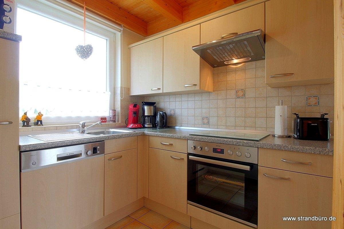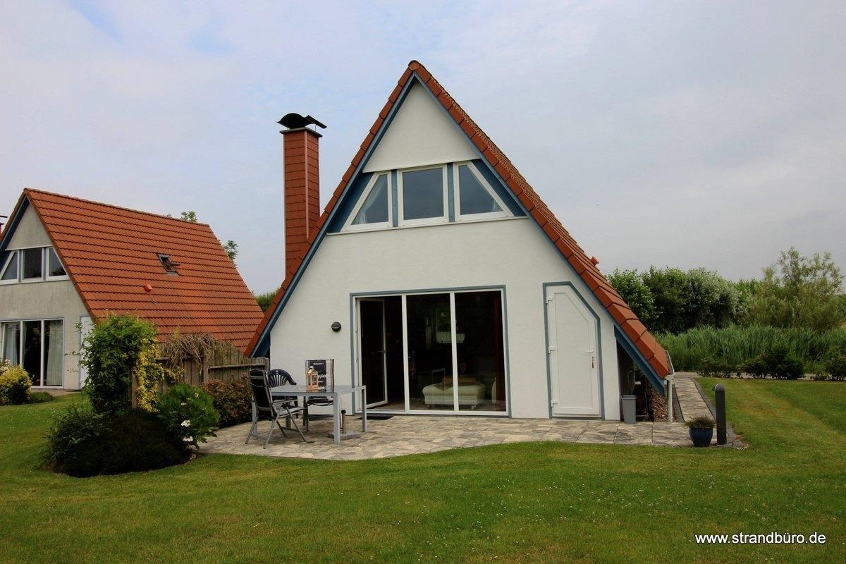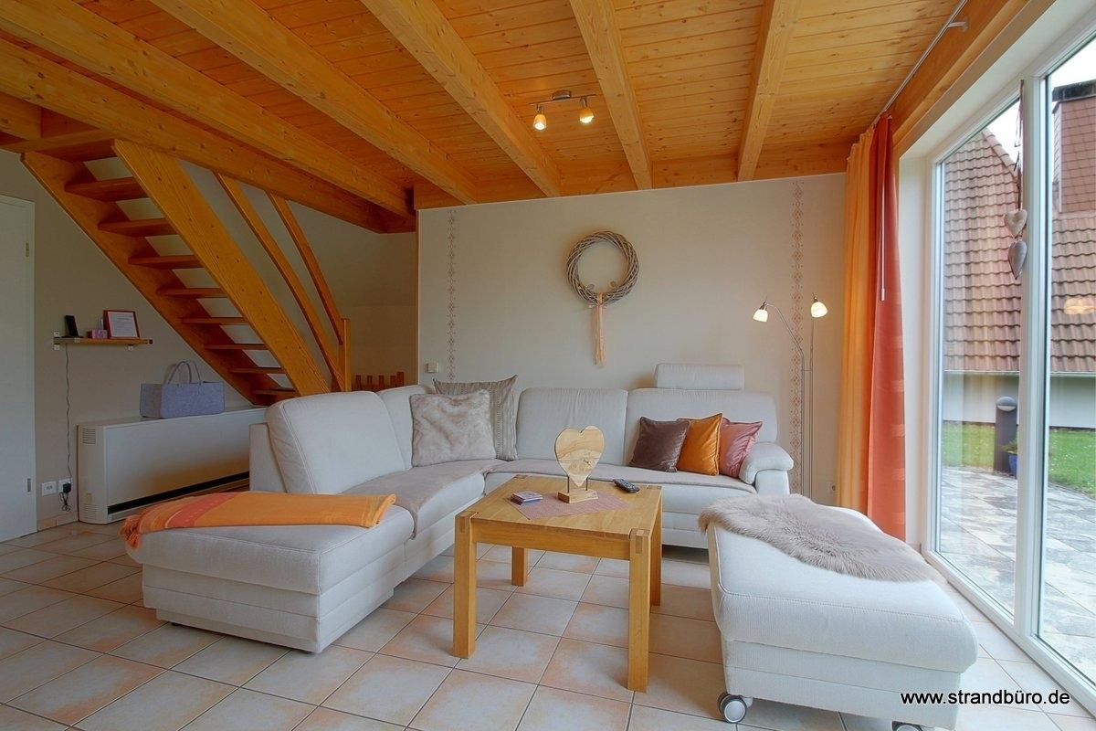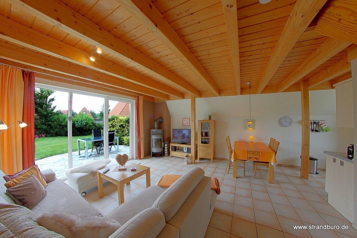 In diesem schick eingerichteten Haus gibt es einen offenen Wohnbereich mit Kaminofen, Flat-TV, Essplatz und offene Küche mit komplett ausgestatteter moderner Einbauküche. Vom Wohnraum aus geht es direkt auf die Terrasse mit Rasenfläche. Der gesamte Wohnbereich ist gefliest, Haustiere sind nicht erlaubt.