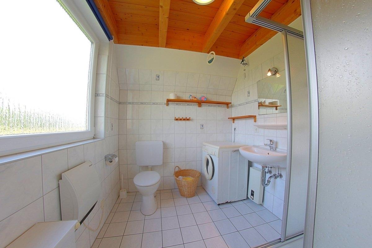 Das Bad im Erdgeschoss ist neben einem Waschbecken und einer Toilette auch mit einer Dusche und einer Waschmaschine ausgestattet.