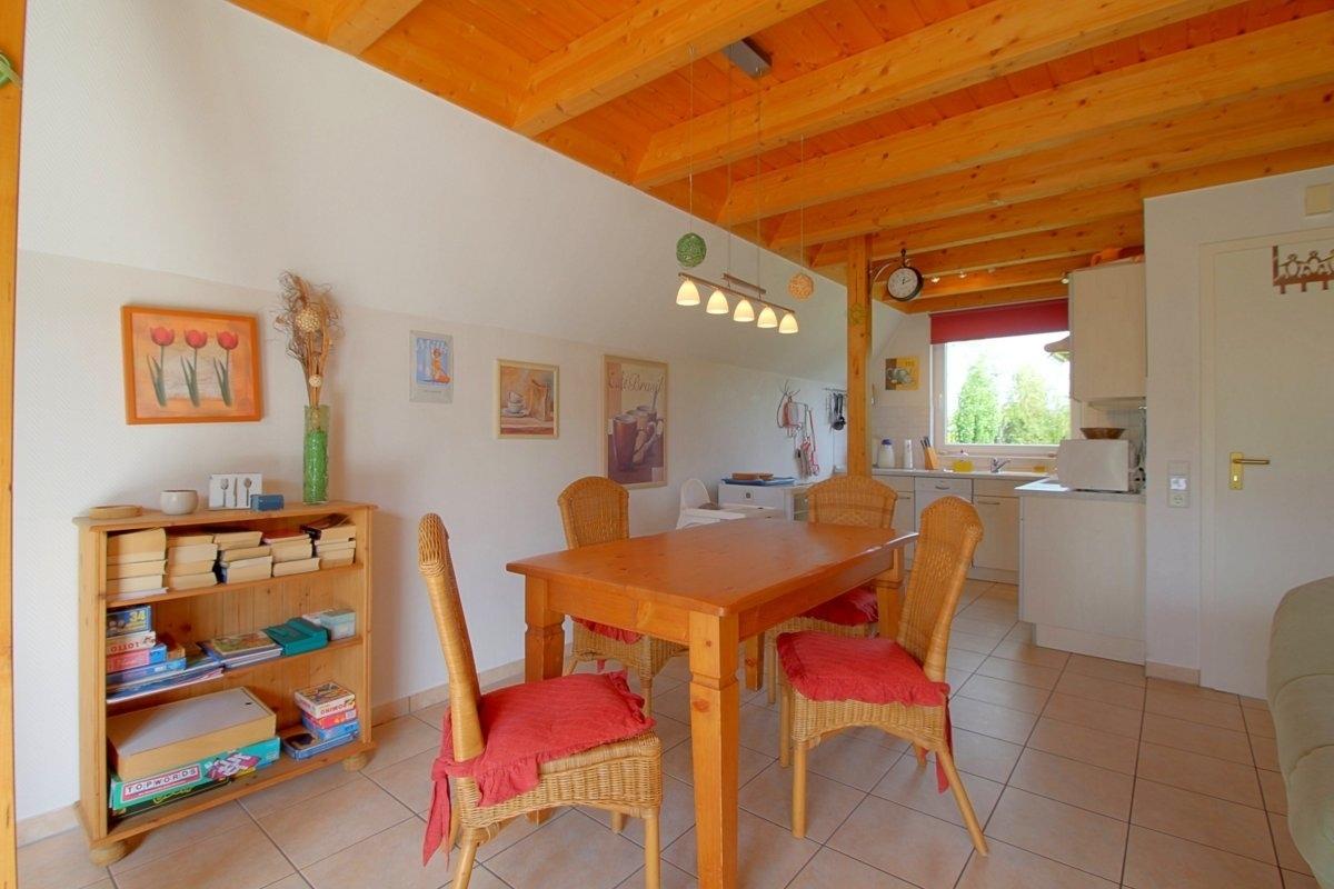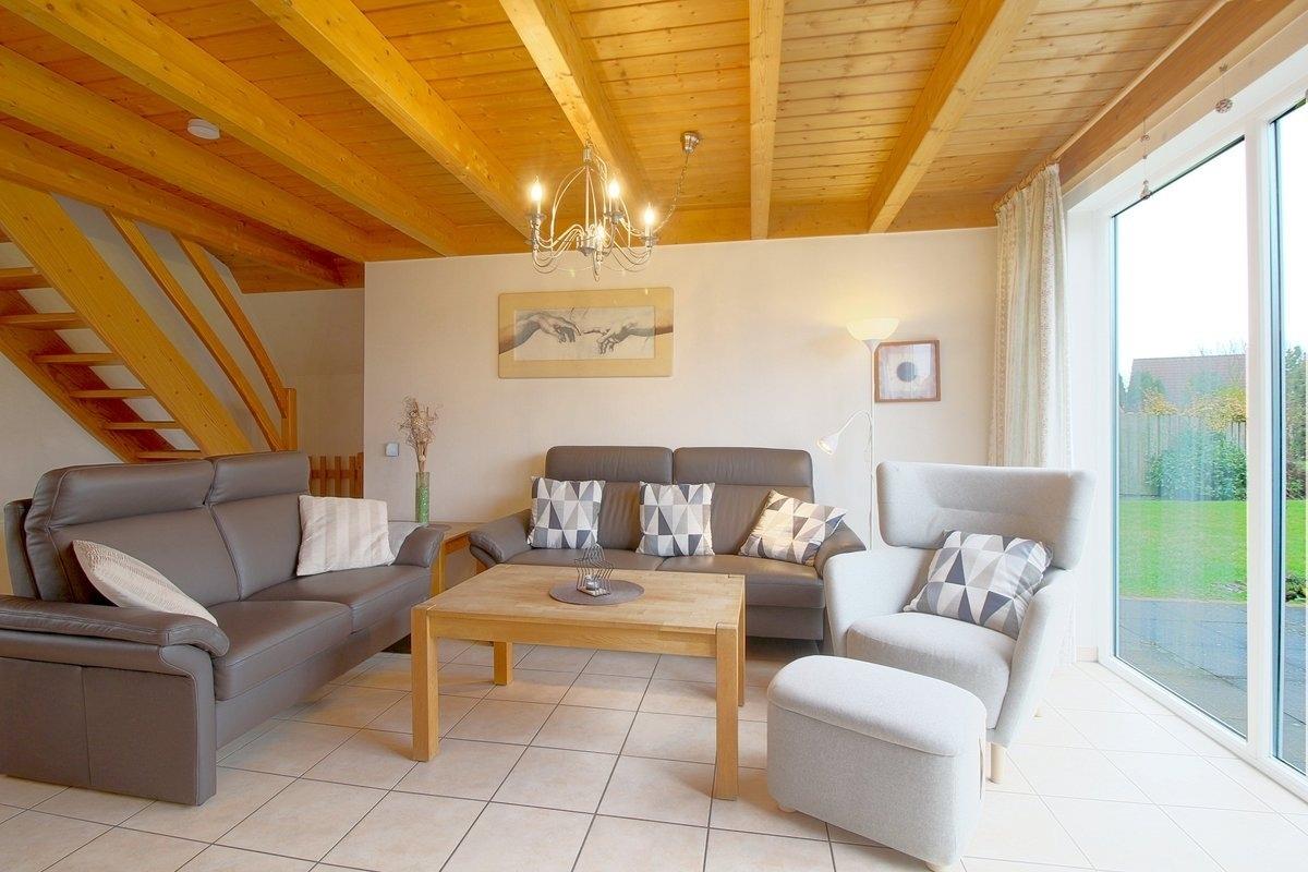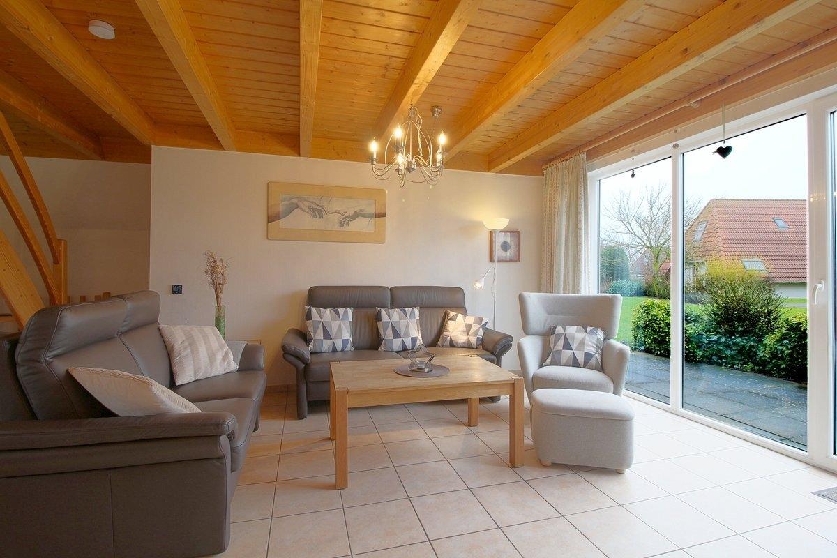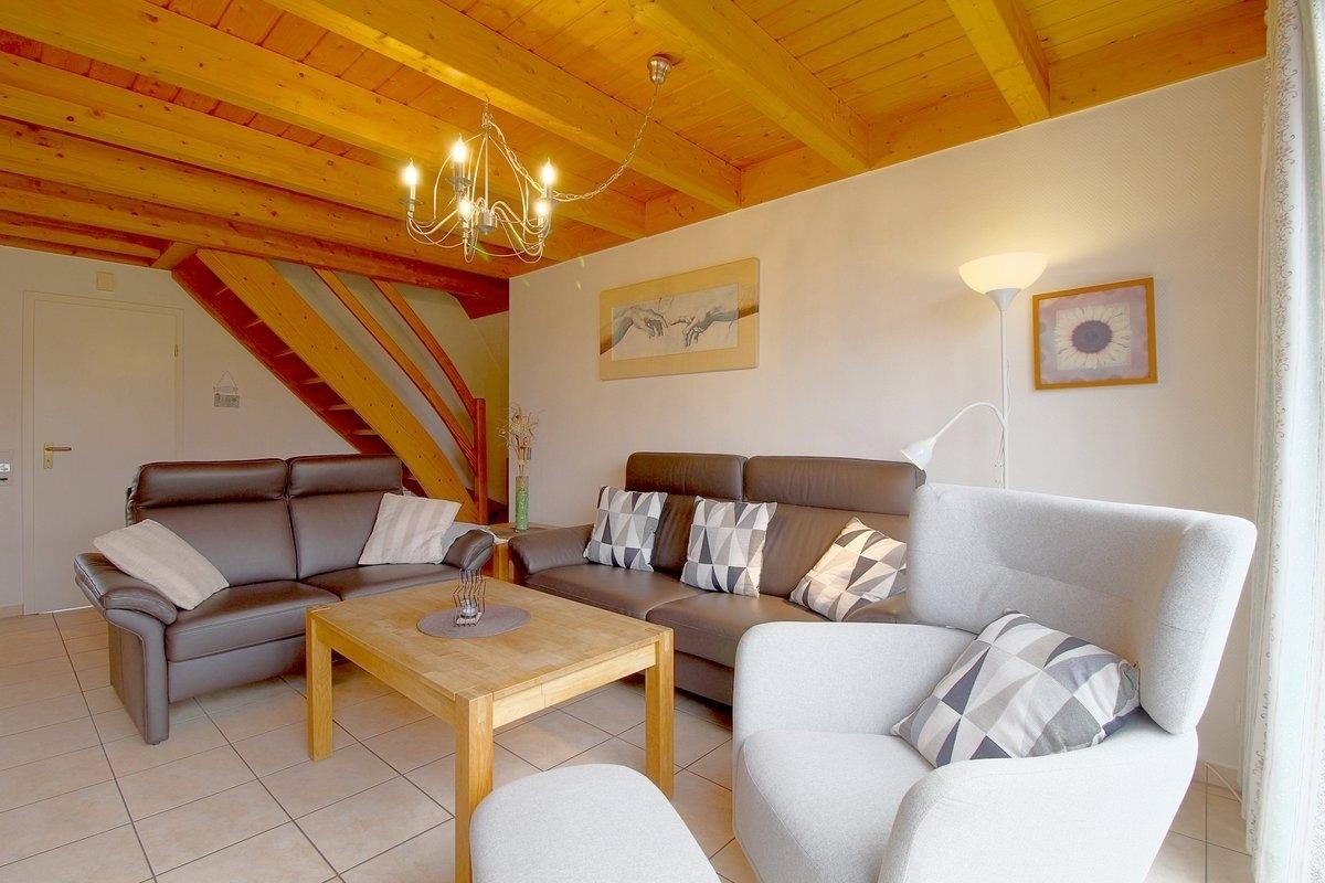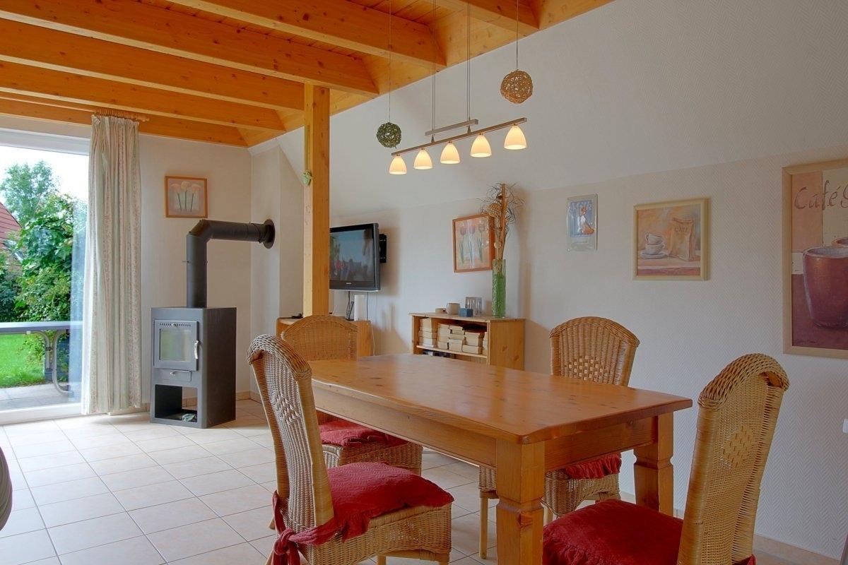 Das Wohnzimmer besteht aus einem offenen Wohn- und Essbereich mit Kamin und einem Esstisch für bis zu 6 Personen. Außerdem gibt es im Wohn- und Essbereich noch ein Sat-TV mit Premiere, eine Stereoanlage mit DVD Player, ein Telefon, Spiele und Bücher sowie kostenloses WLAN mit Glasfaser.