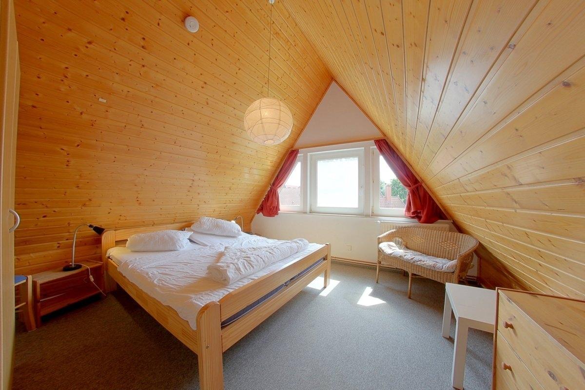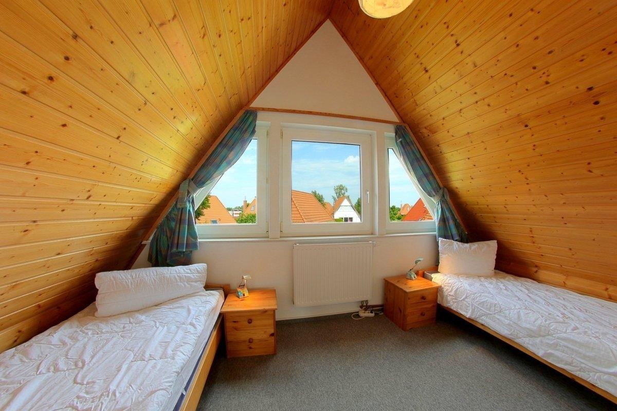 Im Obergeschoß sind das Elternschlafzimmer mit einem Doppel- und dem Kinderreisebett sowie das Kinderzimmer mit zwei Einzelbetten. Die[nbsp] großen Fenster lassen viel Licht herein und sorgen für eine Wohlfühlatmossphäre.