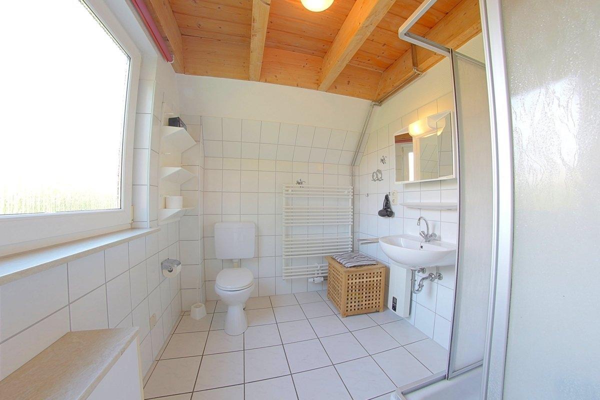 Im Erdgeschoß befindet sich das offene Wohnzimmer mit Küche und Essplatz sowie das geräumige und taghelle Duschbad mit Fön.