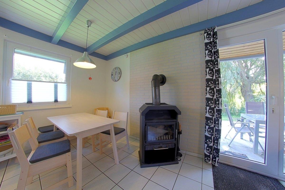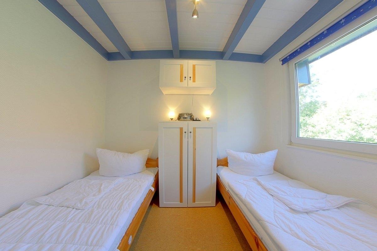 Das Ferienhaus besitzt 3 separate Schlafräume im Ober- und Erdgeschoss. Im Obergeschoss befindet sich ein Schlafzimmer mit Doppelbett und ein zweiter Schlafraum mit 2 Einzelbetten. Ein weiterer Schlafraum mit 2 Einzelbetten ist im Erdgeschoss vorhanden.