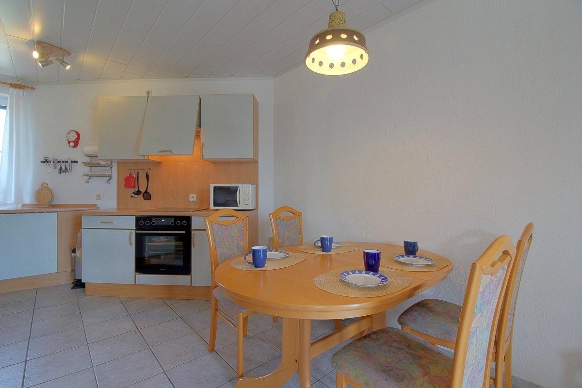 Im Erdgeschoss verfügt das Haus über einen komplett gefliesten Wohnbereich mit Flachbild-TV, Sitzecke, Essplatz für 4 Personen und Ausgang auf die Terrasse.