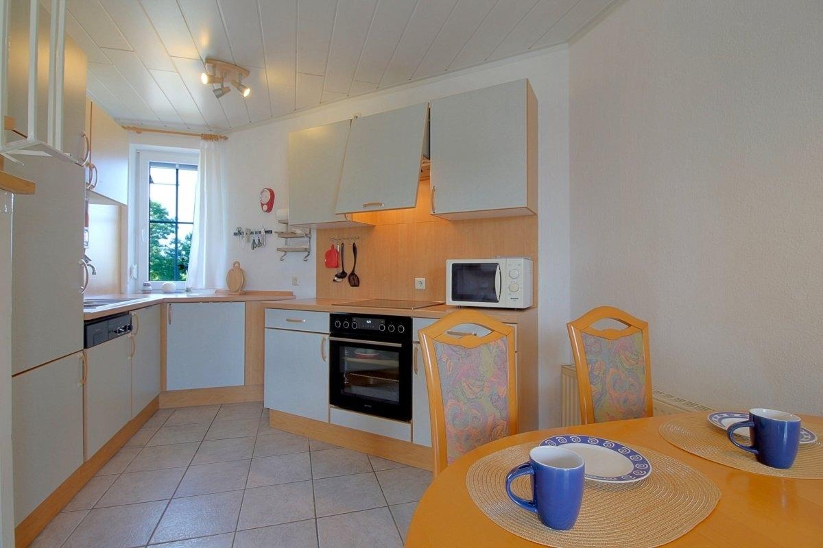 Die offene Küche mit E-Herd mit Backofen, Kühlschrank mit Gefrierfach, Kaffeemaschine, Toaster, Mikrowelle, Geschirrspüler, Waschmaschine und komplettem Geschirr lädt zum kochen ein.