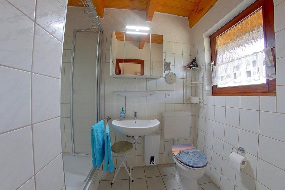 Das Badezimmer mit Fön und Regendusche befindet sich im Erdgeschoss, ein 2. WC ist im Obergeschoss vorhanden.