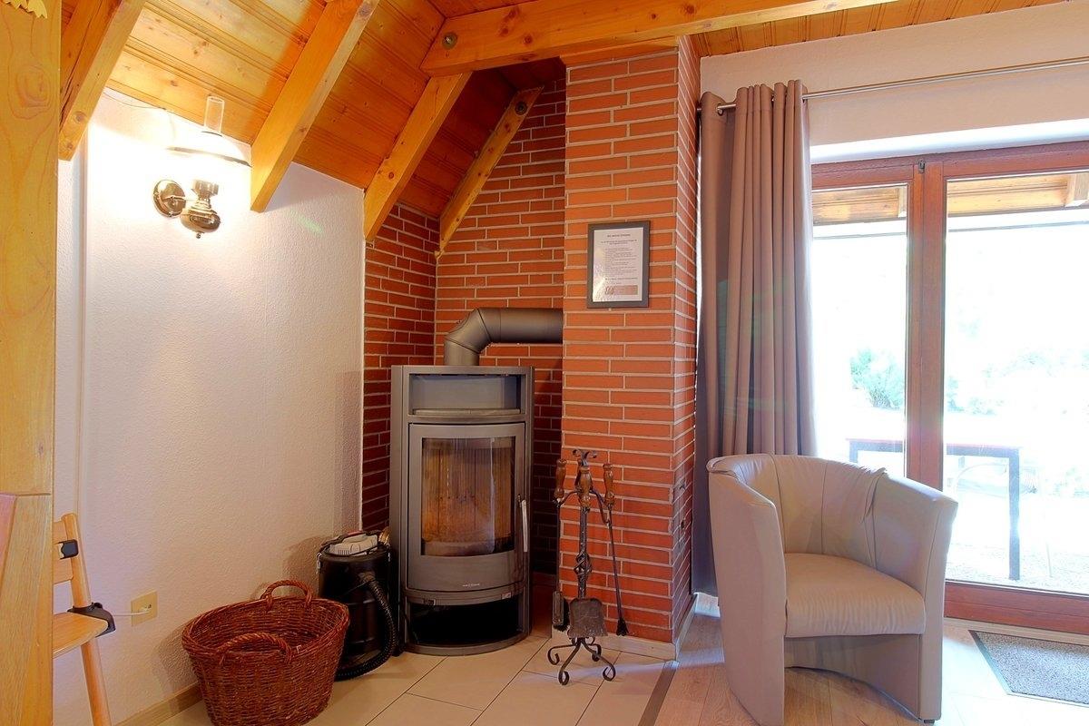 Das gemütliche Wohnzimmer mit Kaminofen schließt an die Küche an.