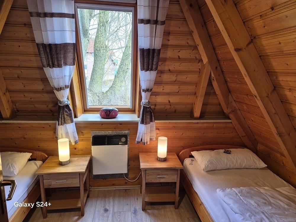 Ebenso ein Schlafzimmer mit zwei Einzelbetten und einem CD Spieler.