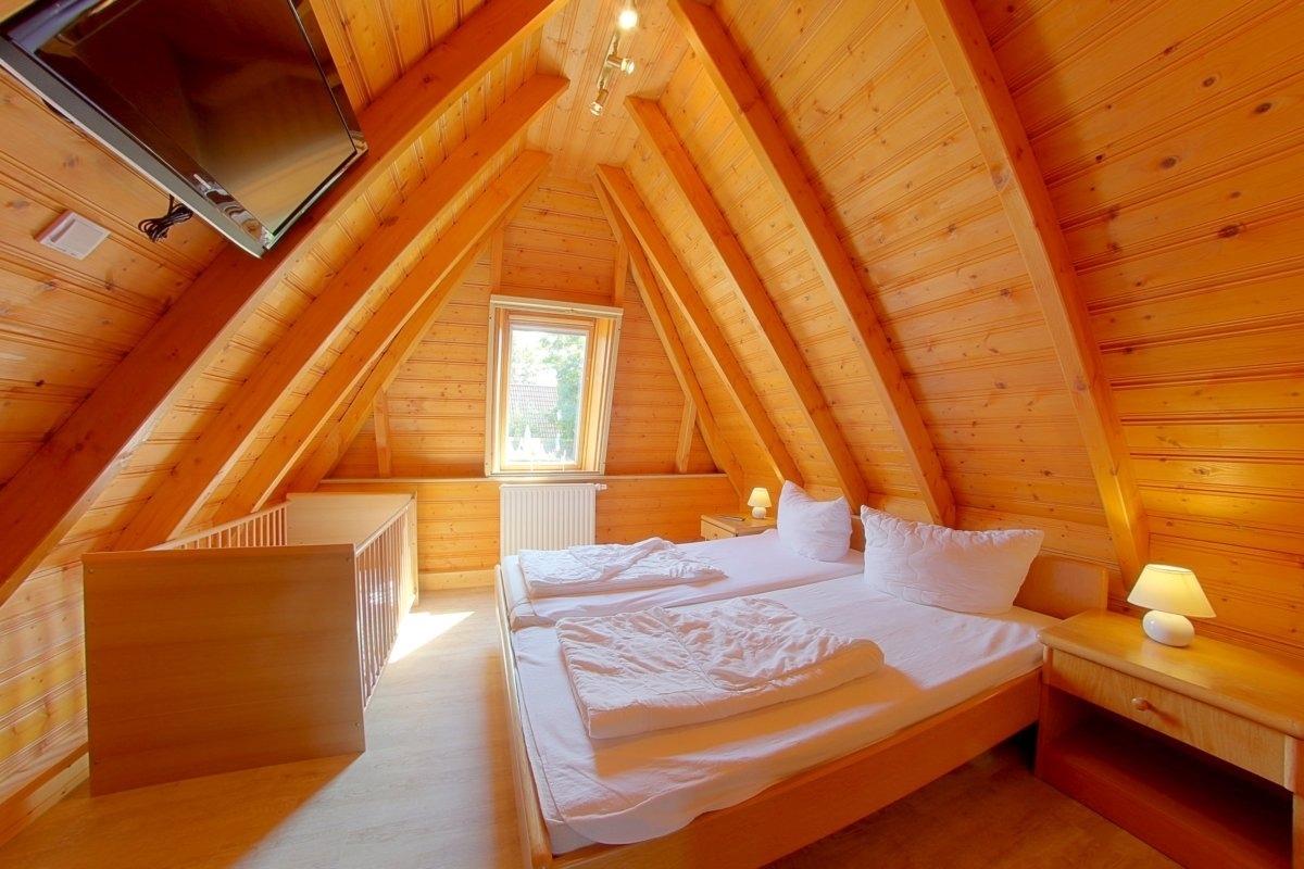 Im Obergeschoss befindet sich das Elternschlafzimmer mit Doppelbett, Babybett und TV, sowie ein weiteres Schlafzimme mit 2 Einzelbetten und ein zusätzliches WC.