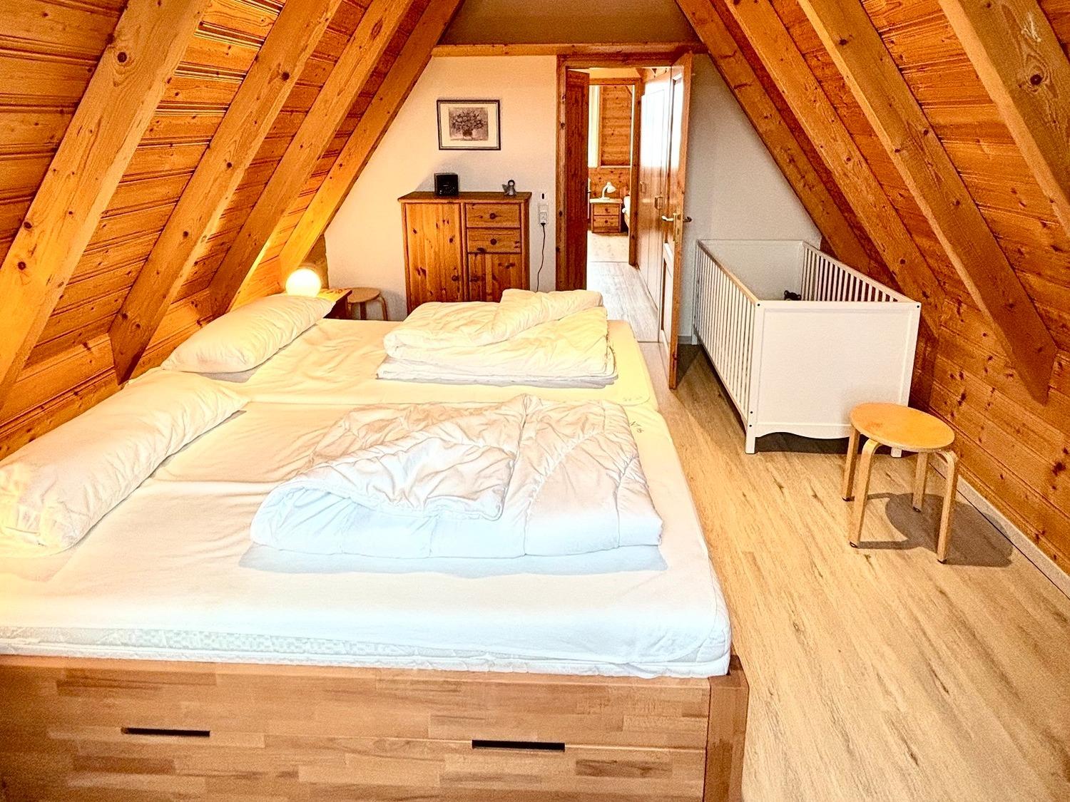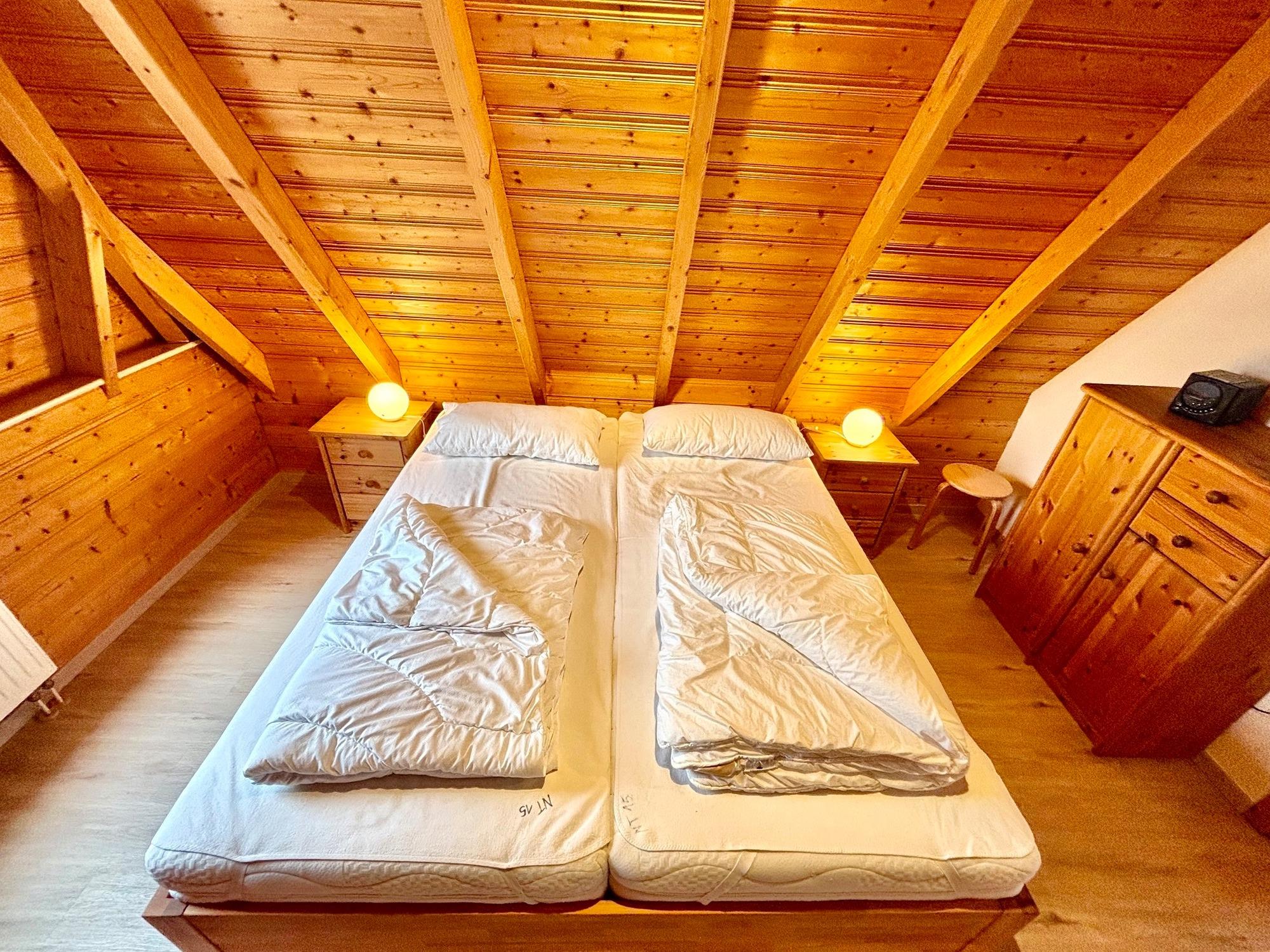 Im Obergeschoss befindet sich ein neues WC, ein kleines Schlafzimmer mit zwei Einzelbetten (90x200cm) und ein großzügiges Schlafzimmer mit einem Doppelbett (180x200cm). Zusätzlich steht ein Kinderbett zur Verfügung. Beide Schlafzimmer sind mit elektrischen Außenjalousien versehen, die für einen erholsamen Schlaf sorgen.