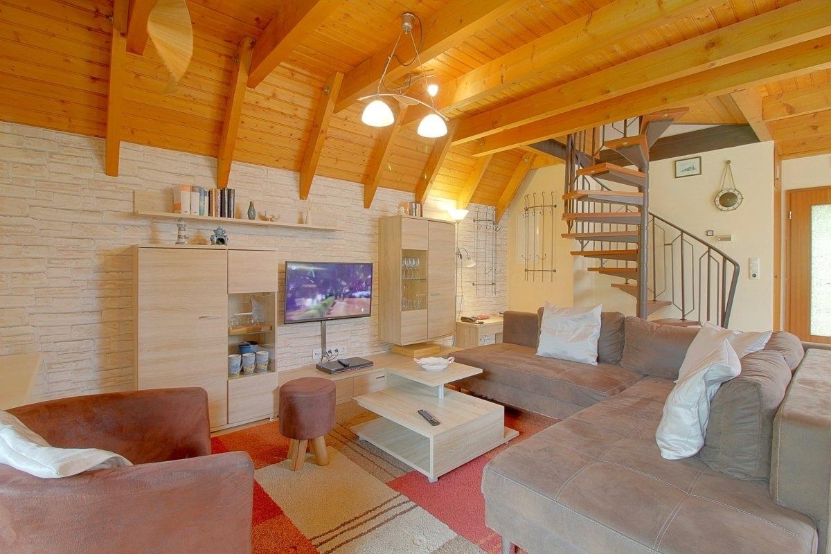 Der Wohnbereich mit Kamin, großem Flat-TV und natürlich kostenlosem Internet bietet genügend Platz für die Familie. Für die Lütten gibt es sogar einen Kindertisch.