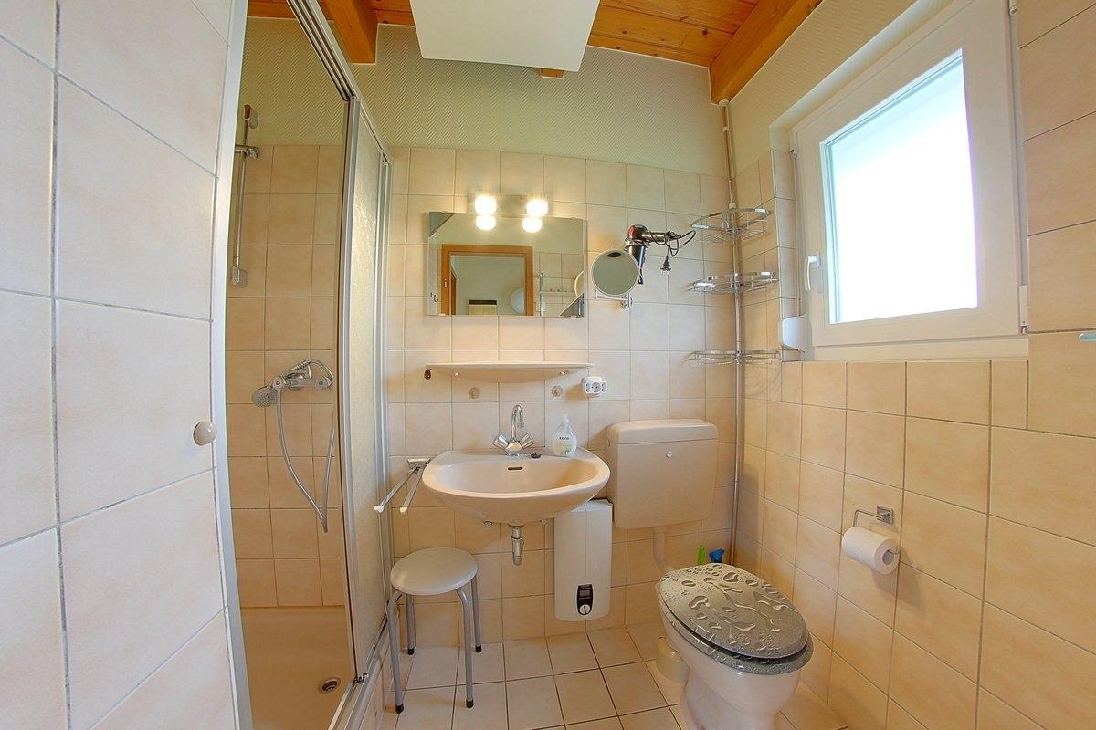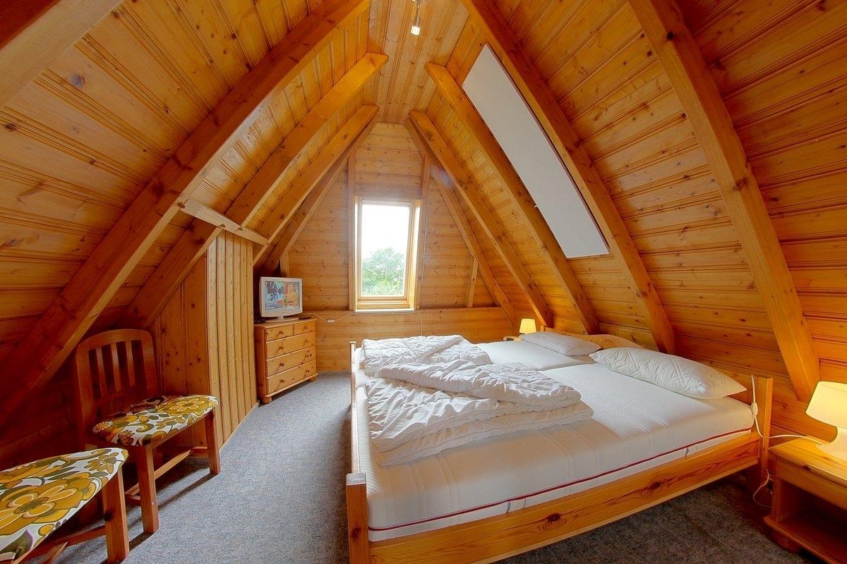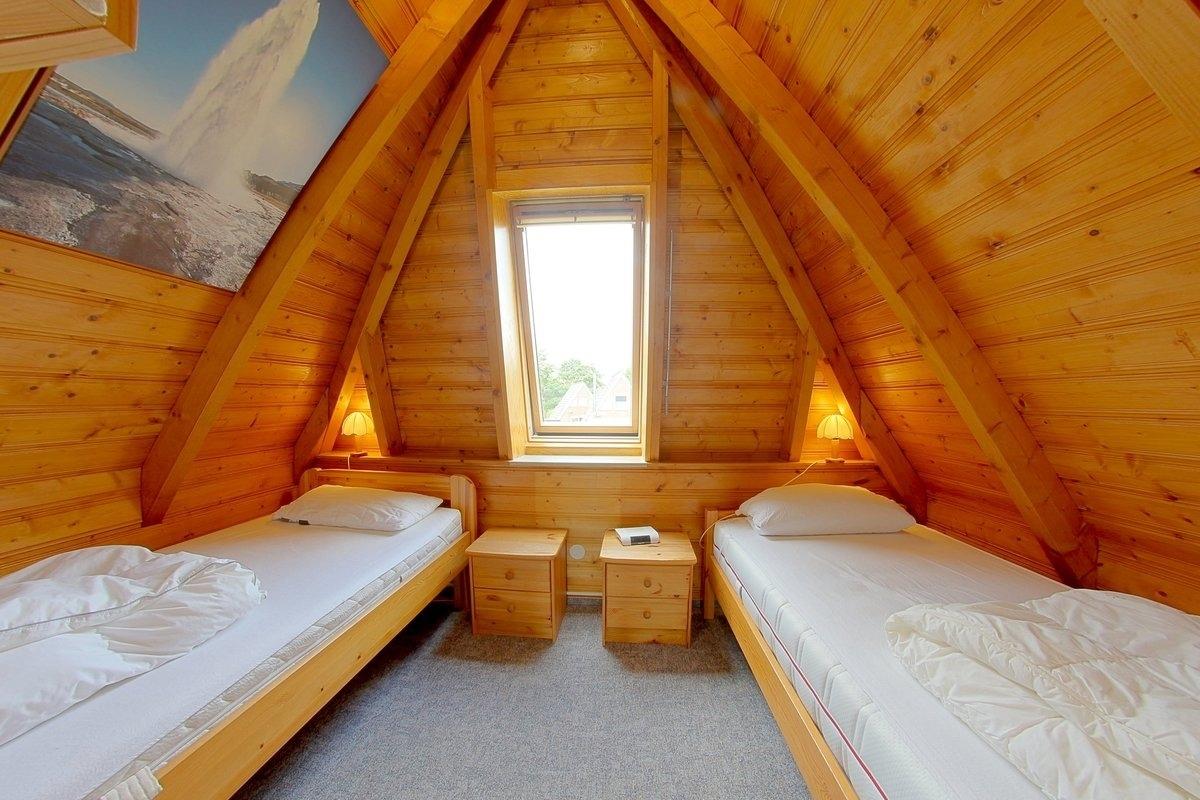 Die Schlafräume befinden sich im im Obergeschoss und sind mit Teppichboden versehen. Elternschlafzimmer mit Doppelbett, TV und Babyreisebett und Kinderzimmer mit 2 Einzelbetten, auch für Erwachsene geeignet (100 x 200 cm). Verdunklungsmöglichkeiten in allen Räumen. Desweiteren ein zusätzliches WC im Obergeschoss.