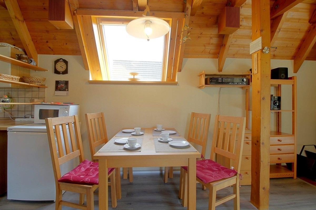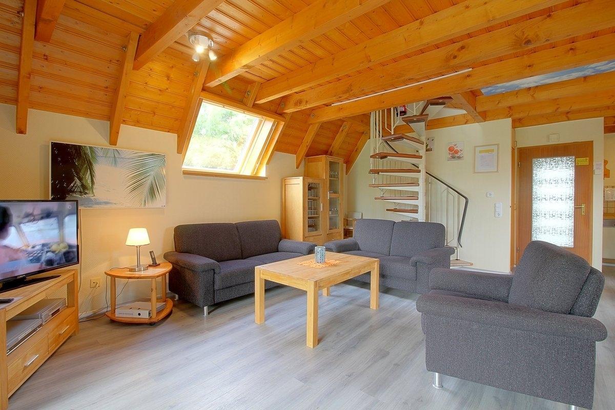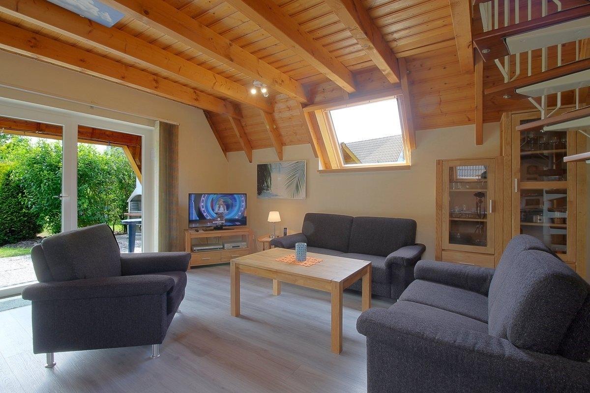 Das Haus verfügt über einen offenen Wohn-, Ess- und Küchenbereich im Erdgeschoss. Der Wohnbereich ist mt Vinylboden ausgestattet. Kaminofen, Flachbild-TV, Stereoanlage, VHS-Player, kostenloses Internet und eine sonnige Terrasse mit Gartenmöbeln und Strandkorb stehen Ihnen hier zur Verfügung.