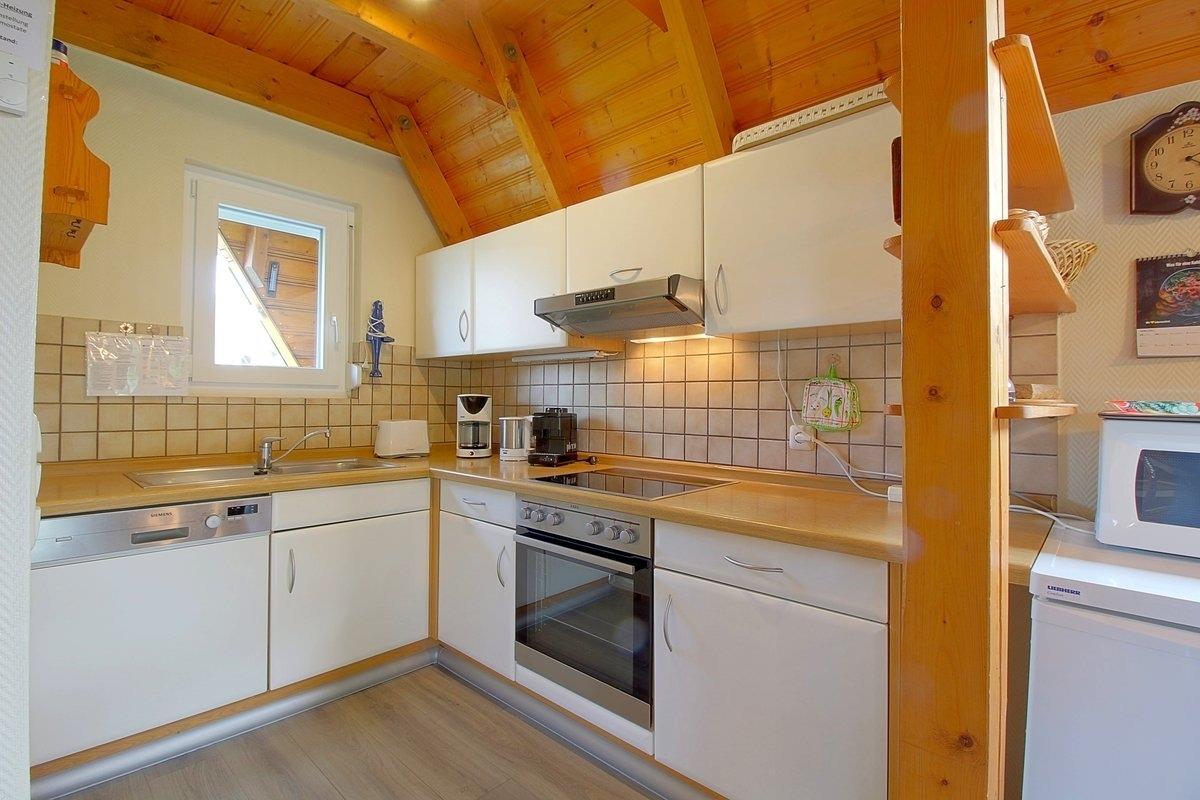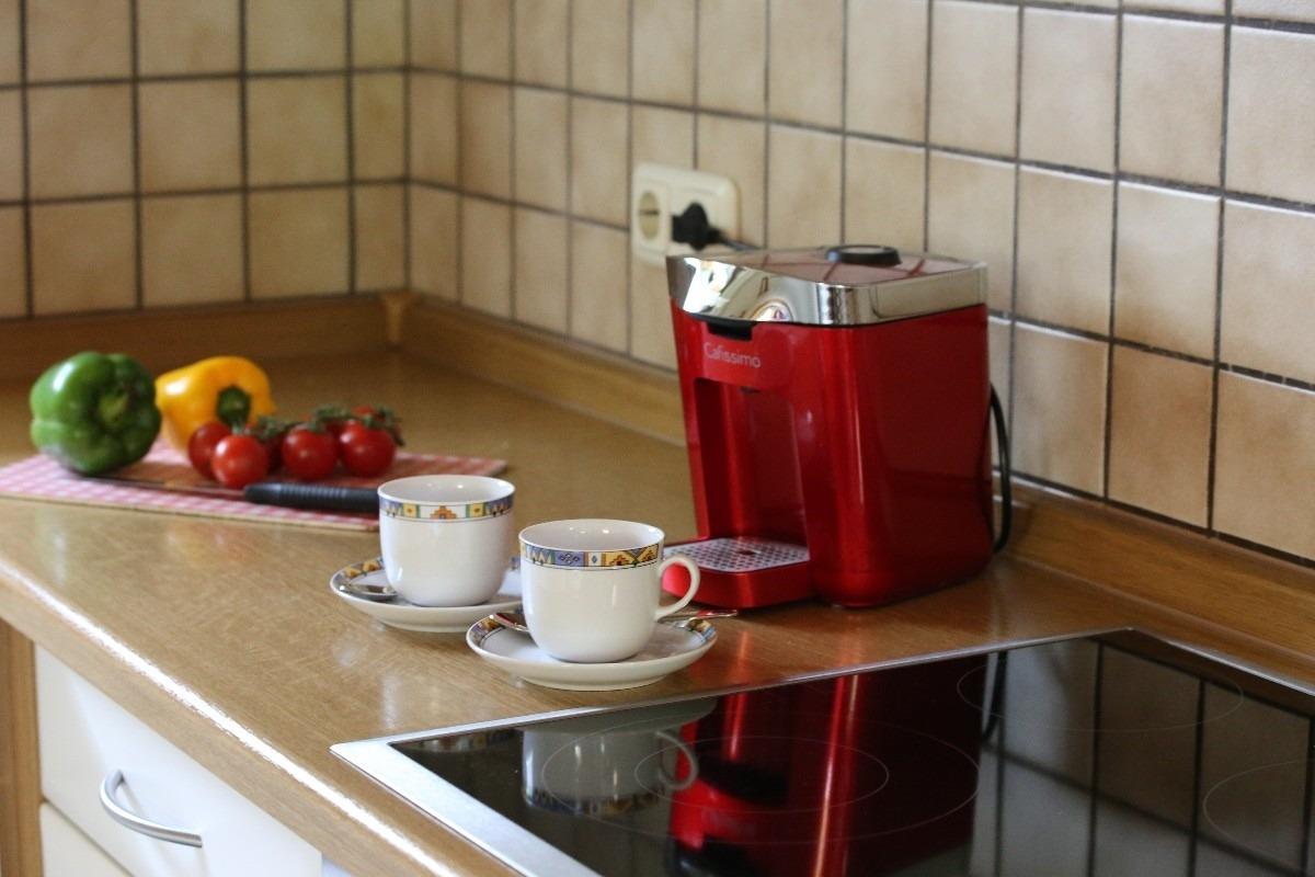 In der Küche mit Geschirrspüler, Mikrowelle, Backofen, Kaffeemaschine, Kapselmaschine (Tchibo), Geschirr und Pött und Pann können Sie leckere Gerichte zubereiten.