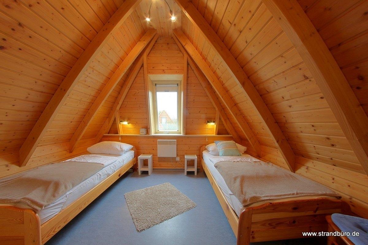 Im Obergeschoss befinden sich zwei weitere Schlafzimmer mit wischbaren Böden und ein WC mit Waschbecken. Ein Schlafzimmer mit Doppelbett und Gitterbett für ein Kleinkind und ein weiteres Schlafzimmer mit 2 Einzelbetten. In allen Elektrische Rollläden zur Verdunkelung sorgen für viel Komfort.