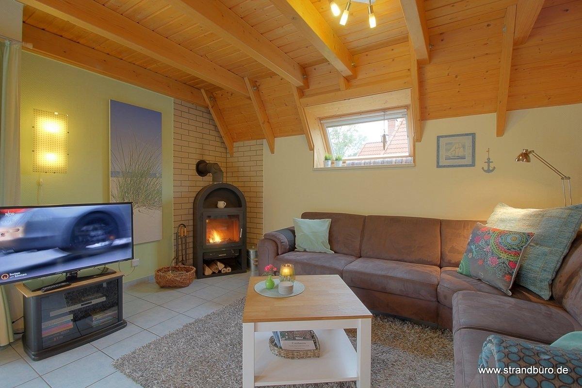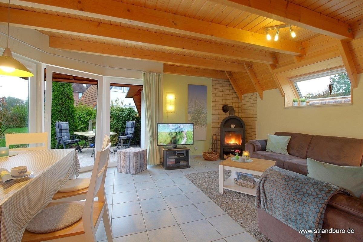 Im gefliesten Wohnbereich gibt es einen offenen Wohnbereich mit Kamin und großem großen Flat-TV, Essplatz und Küche mit komplett ausgestatteter moderner Einbauküche. Von hier aus geht es auf die Terrasse mit Abstellraum und Grillkamin.