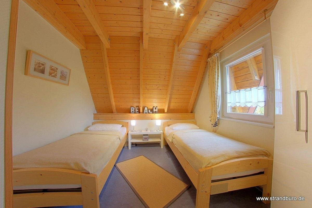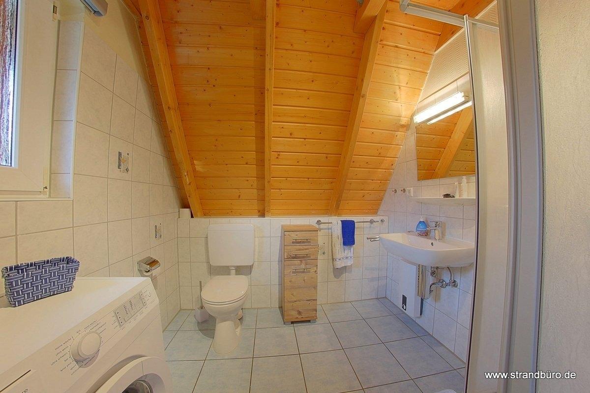 Im Erdgeschoß gibt es ein Schlafzimmer mit zwei Einzelbetten (zusammenschiebbar) und wischbaren Bodenbelag und ein modernes, helles Duschbad mit Waschmaschine.