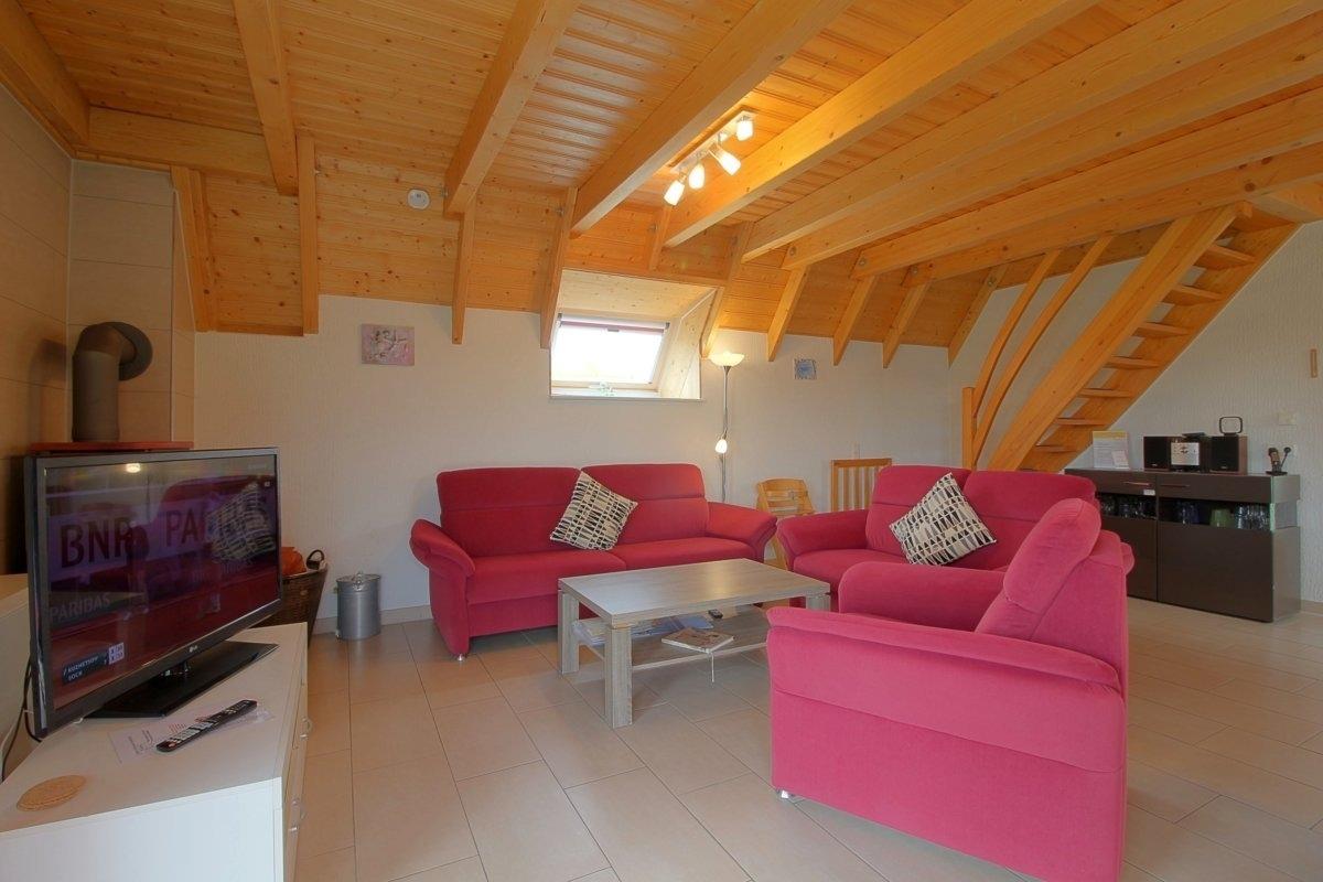 Alle Möbel sind modern, neu und farblich aufeinander abgestimmt. Im Untergeschoss befindet sich der Wohnbereich. Bequeme Polstermöbel, ein großer Esstisch, Deckenfluter ein großer 42-Zoll Flachbildschirm sowie kostenloses Internet laden zum Entspannen ein.