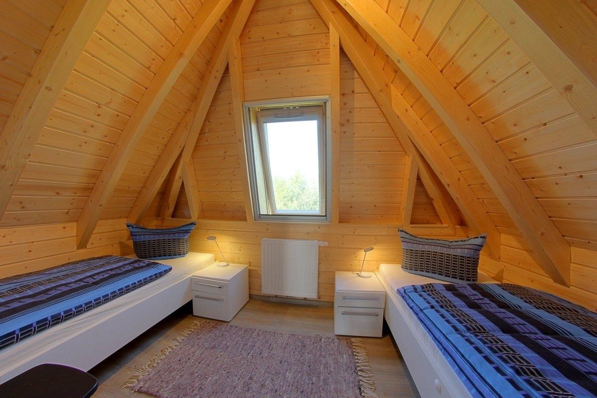 Im Obergeschoss befindet sich ein großes Schlafzimmer mit Doppelbett, Babybett und TV, sowie ein weiteres Schlafzimmer mit 2 Einzelbetten und ein zusätzliches WC.