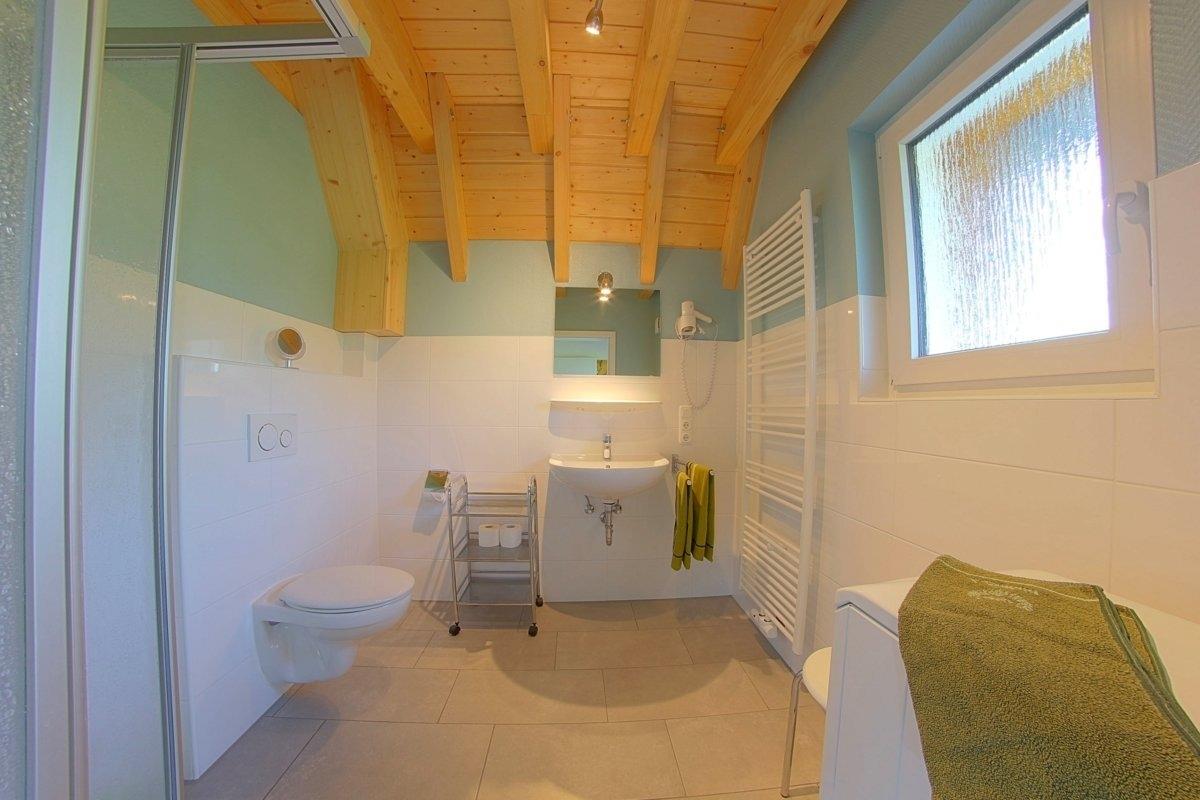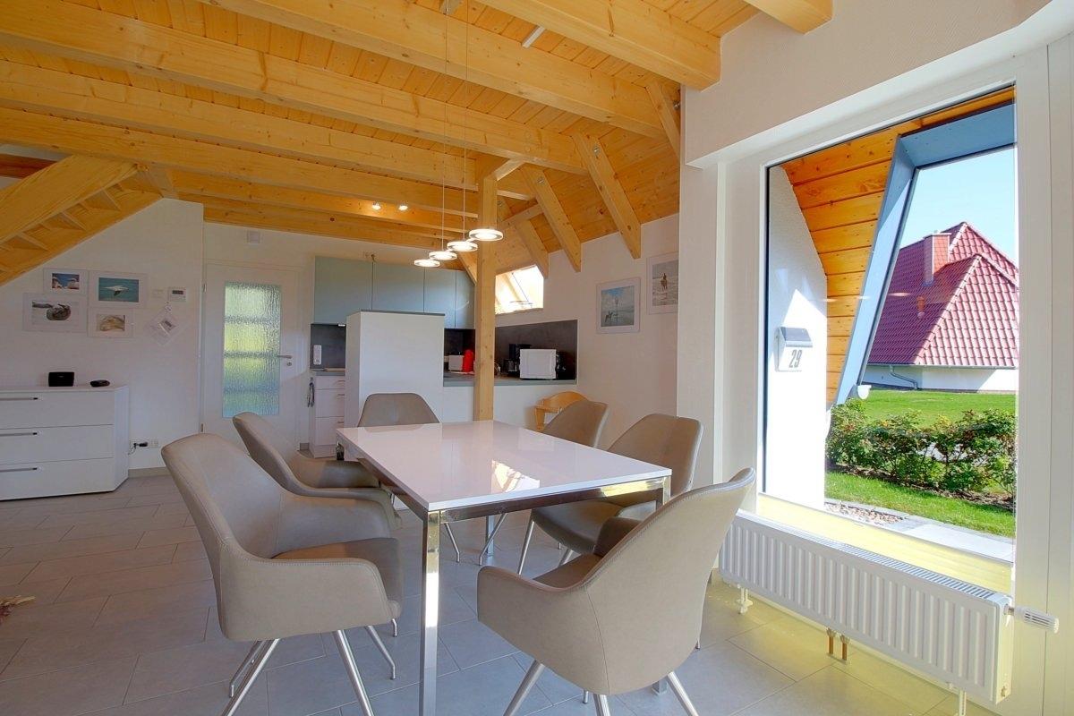 Die Küche ist komplett ausgestattet, hier kann der Smutje leckere Gerichte zaubern. Der Essplatz für bis zu 6 Personen bietet Platz für die ganze Familie. Ein modernes Duschbad mit Tageslicht, Dusche mit Flacheinstieg, Handtuchheizung und Waschmaschine befinden sich ebenfalls im Erdgeschoss.
