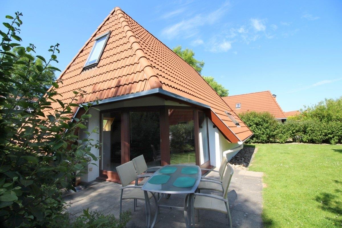 Gemütliches Nurdachhaus mit Terrasse und Garten im Ferienpark Cuxland, ideal für entspannte Urlaubstage.