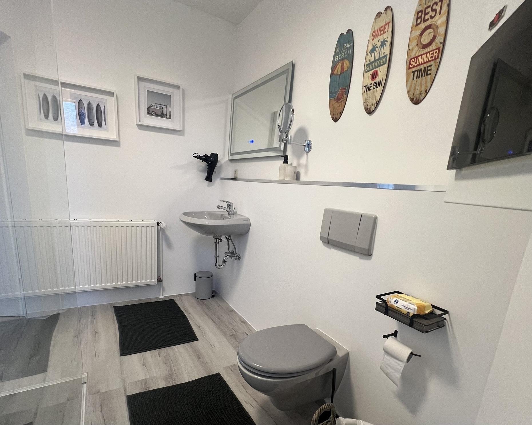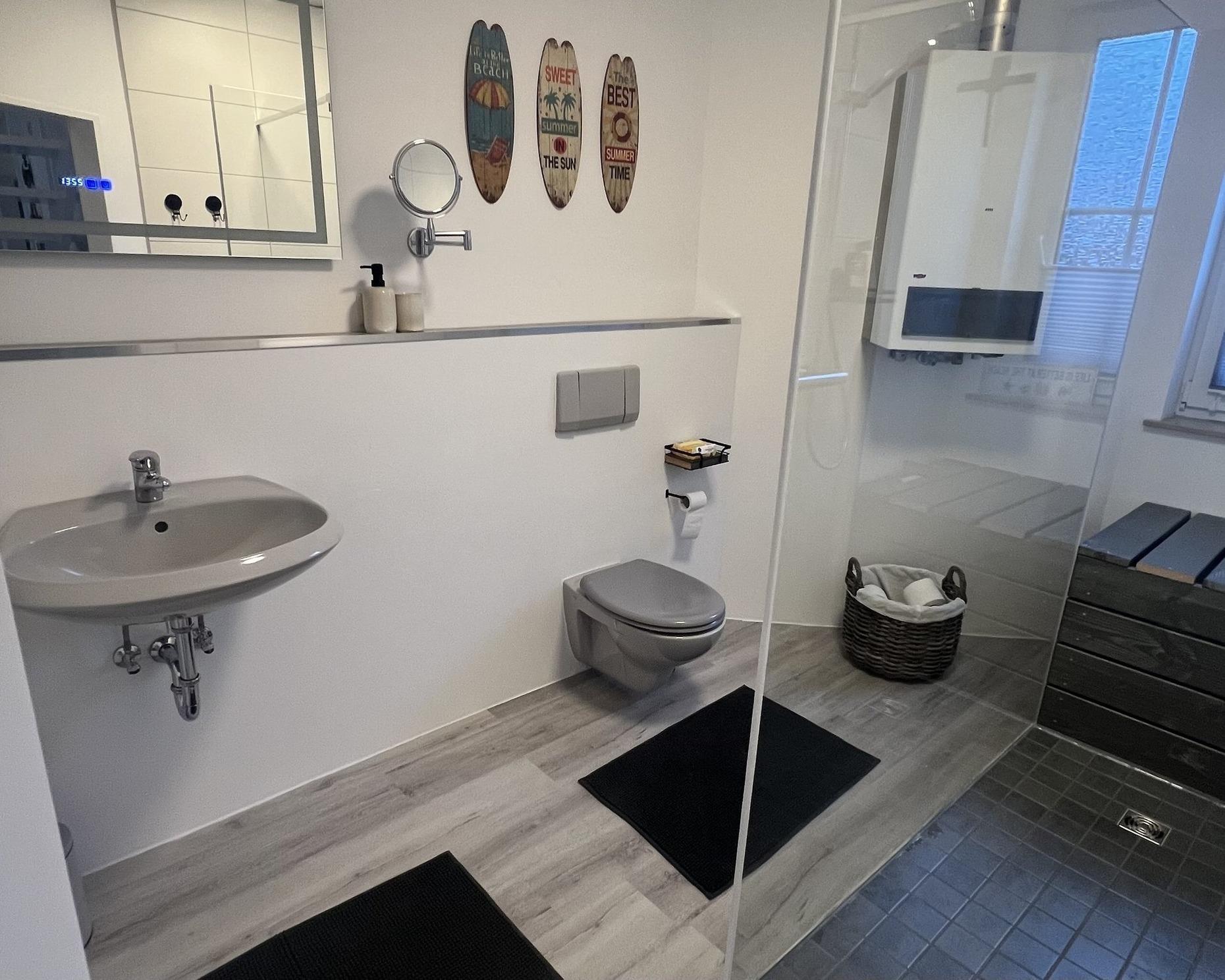 Das Duschbad mit begehbarer sehr großer Dusche und WC liegt ebenfalls im Erdgeschoß, sowie der Abstellraum mit Waschmaschine. Eine Wellness-Oase im kuscheligen Nordseebad Dorum-Neufeld.