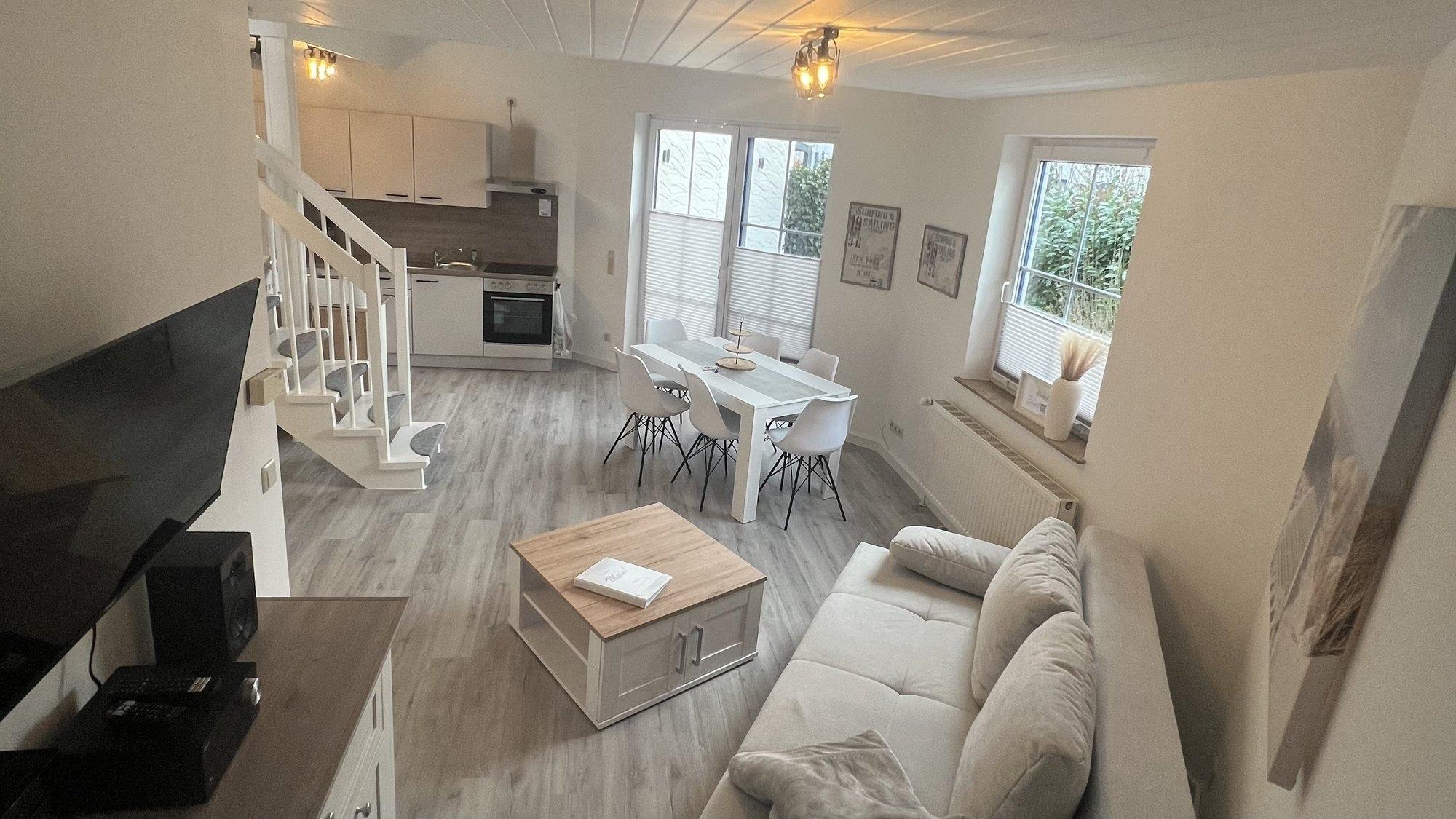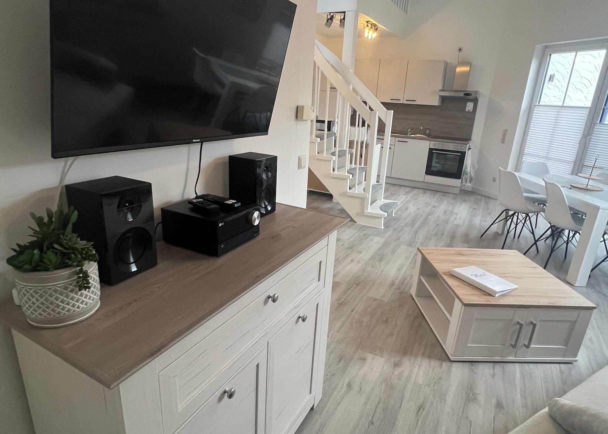 3 Fernseher im Haus bieten höchsten Komfort. Das Achteck-Haus mit Blick auf die Schafe am Deich. WLAN im ganzen Haus. Im Erdgeschoß finden Sie einen offenen Wohn-/Ess- und Küchenbereich mit sehr gut ausgestatteter Einbauküche, die keine Wünsche offen lässt und den Smutje allein oder mit seinem Küchenteam zum Kochen einlädt.