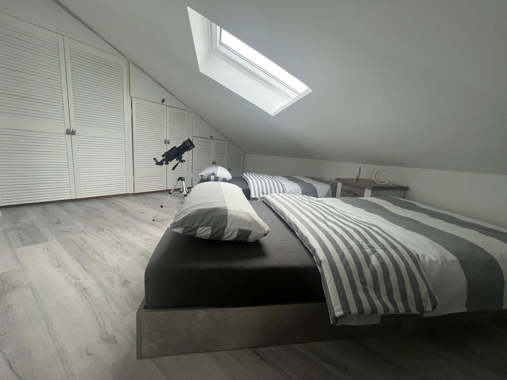 Im Obergeschoß befindet sich ein Schlafzimmer mit 2 Einzelbetten, die auf Wunsch zu einem Doppelbett verbunden werden können. Ein Flachbildfernseher steht zur Verfügung (Streamingdienste können mit eigenem Account genutzt werden). Mit dem Teleskop ist für Groß und Klein ist der Blick in die Sterne sicher.