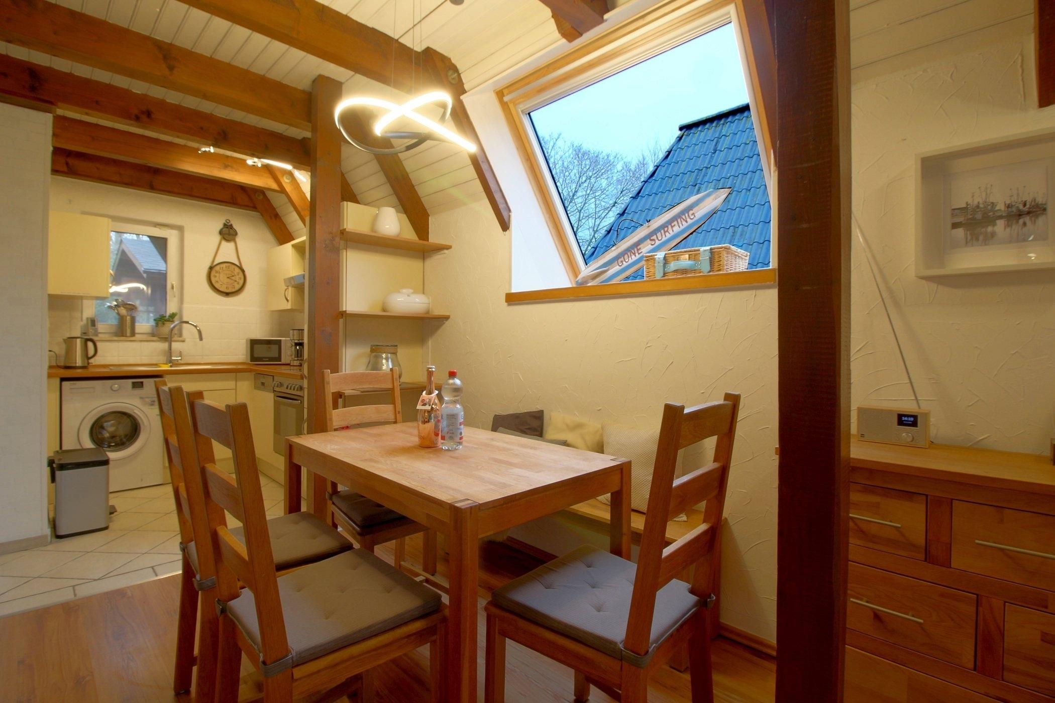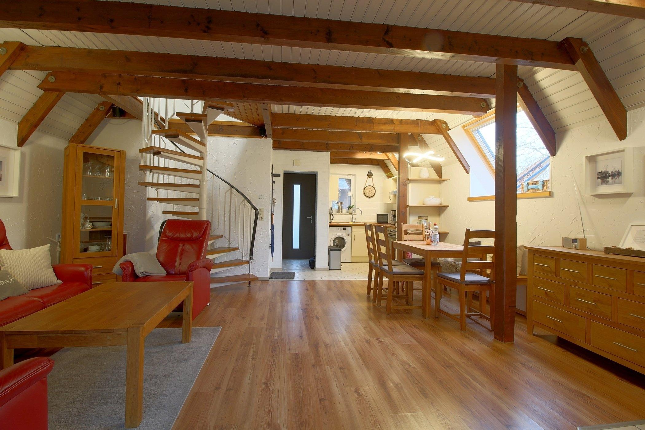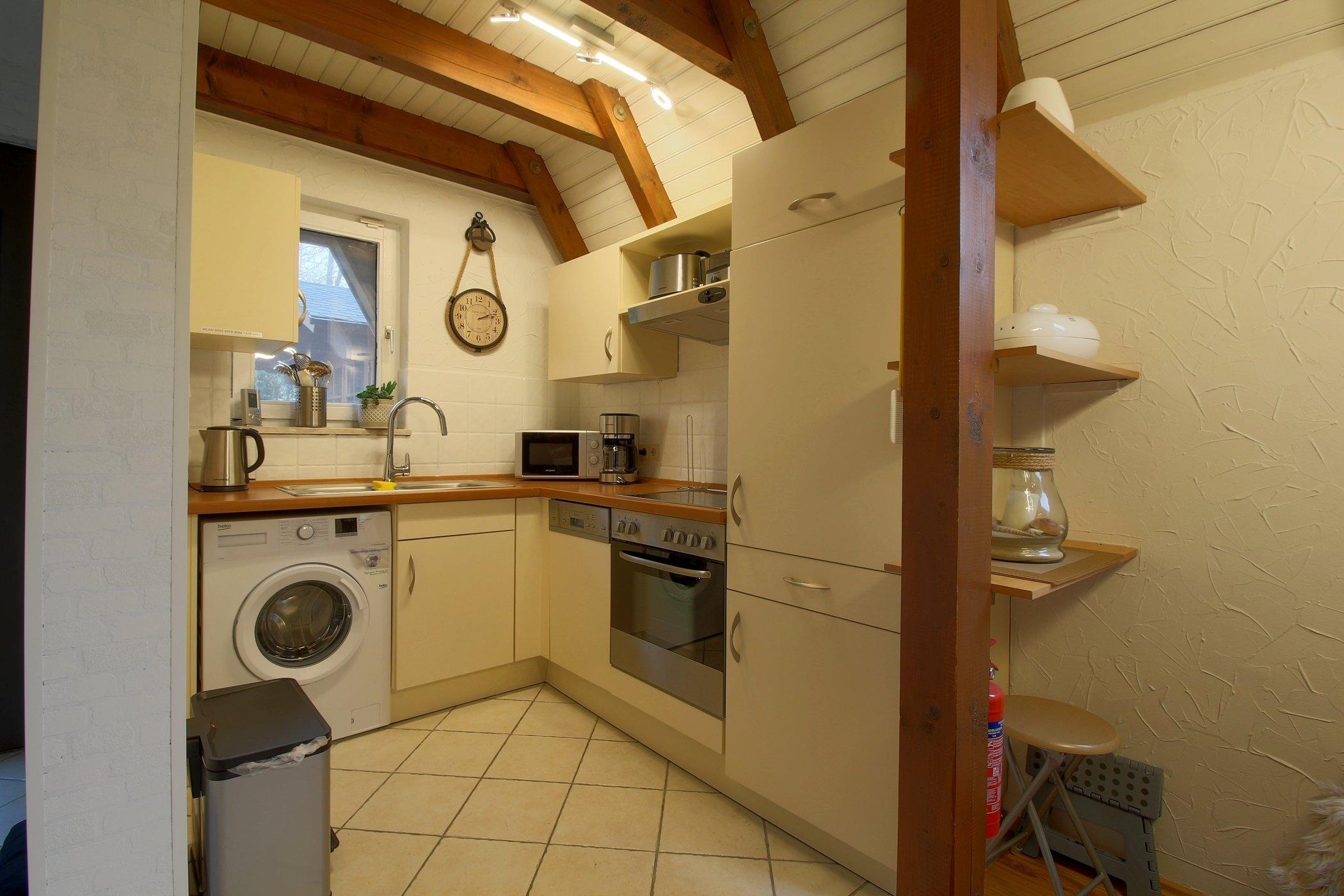 Das Nurdach-Haus befindet sich in einer Sackgasse. Im Erdgeschoß finden Sie einen offenen Wohn-/Ess- und Küchenbereich mit sehr gut ausgestatteter Einbauküche, die keine Wünsche offen lässt und den Smutje allein oder mit seinem Küchenteam zum Kochen einlädt. Die Waschmaschine ist praktischerweise in der Küchenzeile eingebaut.